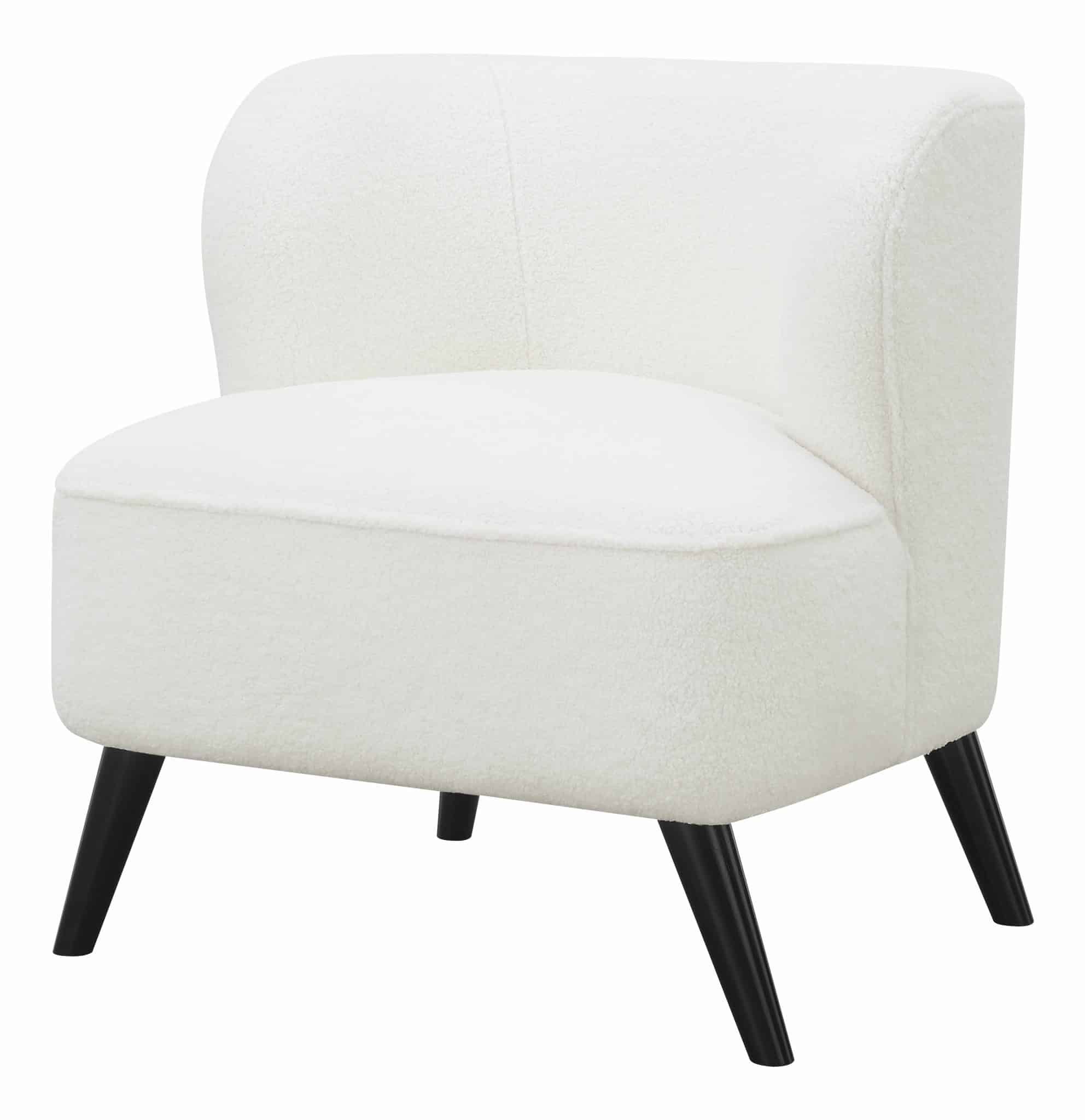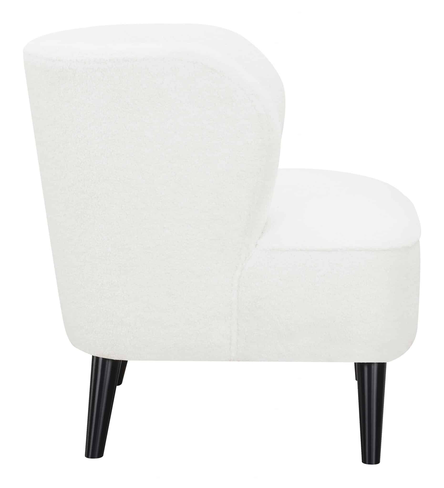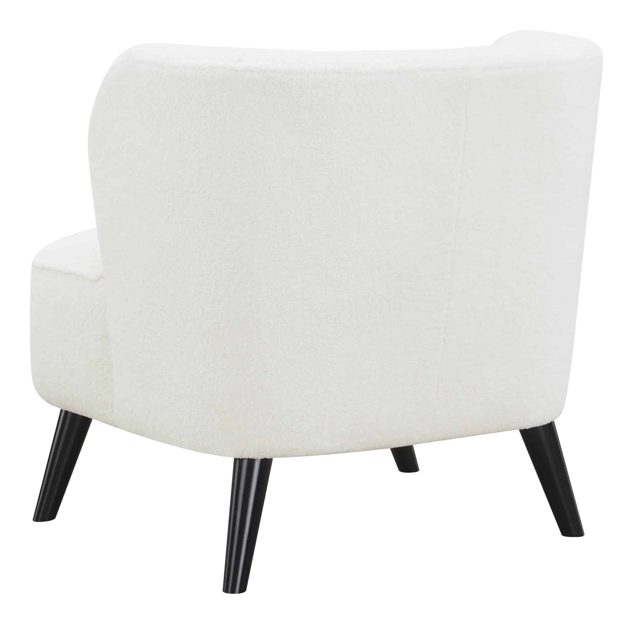 Lend a retro-inspired chic modern aesthetic to seating area and corner nooks with this contemporary accent chair. Designed with a deep barrel style seat with a traditional wingback design, this stylish accent chair works with all kinds of vintage-leaning home decor styles. Adding a supremely soft texture is a natural tone faux sheep skin upholstery. Along the dense tight seat is a thick welt trim that defines the outer edge of the clean, bright fabric. Pushing the mid-century modern vibes are slender flared legs in a bold cappuccino finish.