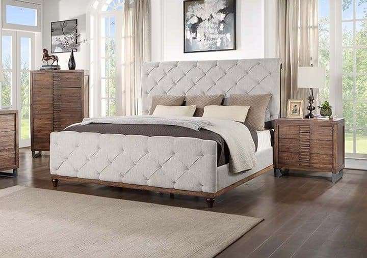 This Andria upholstered bed features an impressive rolled headboard. Generously padded features deep handcrafted buttonless tufting on the headboard to create a luxury decorative classic feeling. The woven upholstery fabric gives the bed a sophisticated finish. Exposed wooden feet and trim are in a reclaimed finish are the perfect finishing touch.