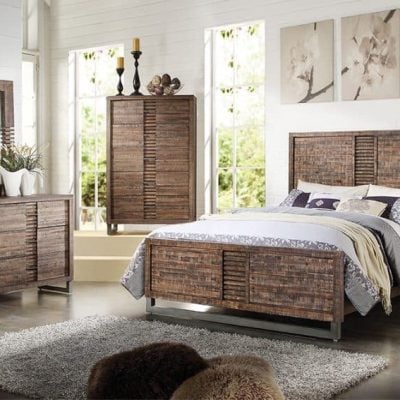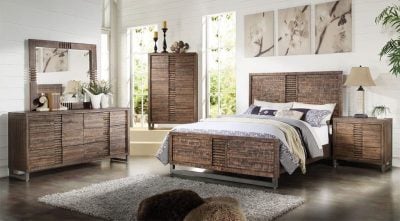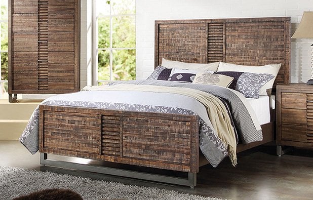 The Andria Bedroom Collection features a transitional rustic, industrial style. Use of the slats in the center of the drawer and hardware to match the slats creates a uniform design element.