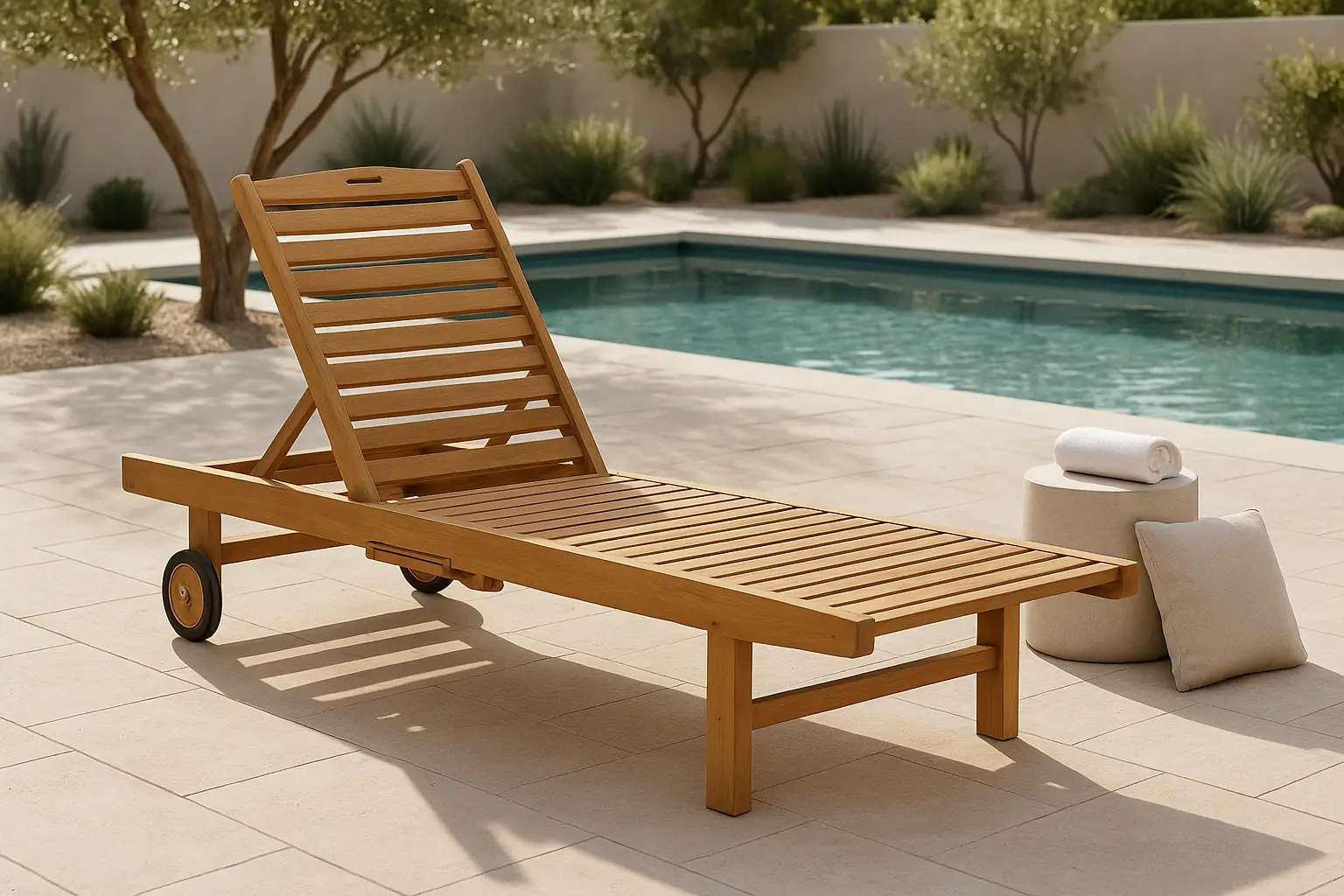 The Andy Solid Wood Chaise Lounge Chair is a high-quality outdoor lounger made from durable teak wood with a natural finish. Designed for both comfort and convenience, it features an extended reclining seat, rear wheels for mobility, and a hidden pull-out tray. Treated for indoor and outdoor use, this all-weather wood lounger is a stylish addition to patios, decks, and pool areas. With its minimalist design and solid construction, the Andy lounge chair blends timeless appeal with modern functionality — perfect for long, relaxing days in the sun.