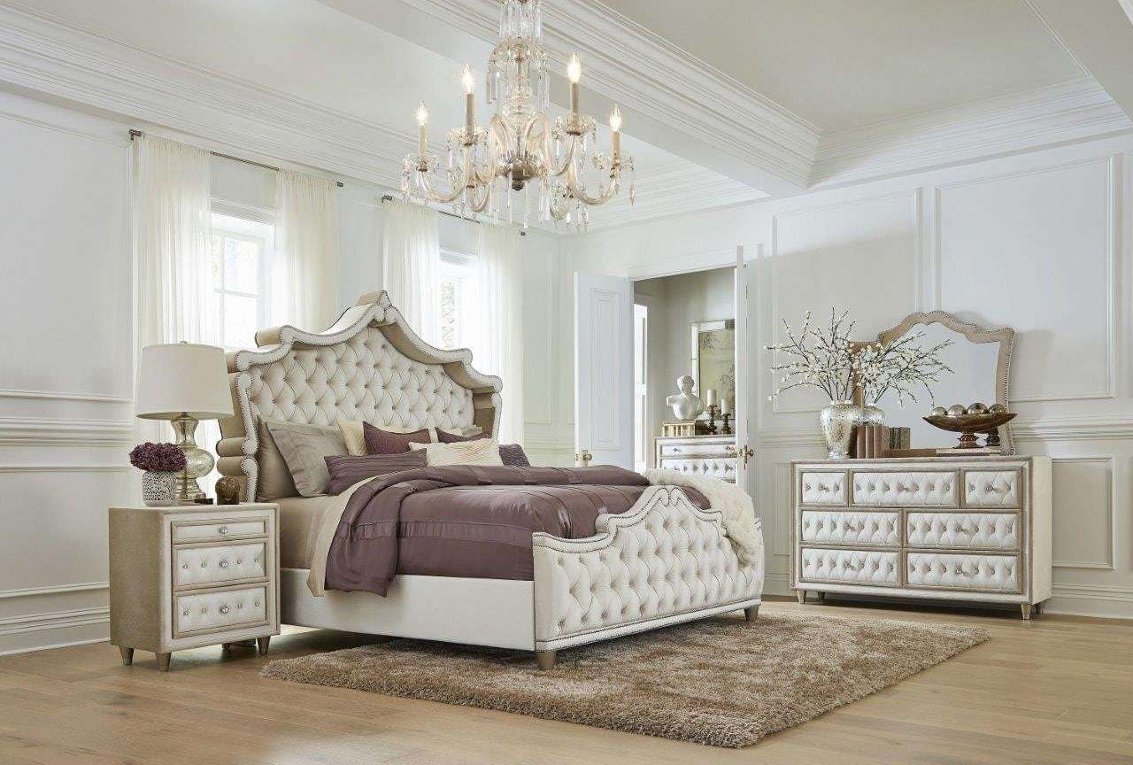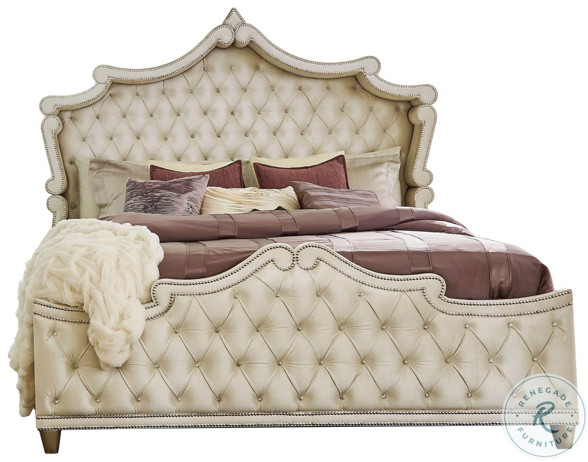 Exquisite traditional and modern flair is found within this grand upholstered bed. An oversized upholstered headboard offers a large recessed panel to create a small covered area, inspired by wingback headboard designs. Both the head and footboard are adorned with dual rows of chrome nailhead trim. Incredible button tufting on this bed is enhanced with faux crystal buttons. Inspired by French Provincial decor, this bed is bound to bring incredible style to your space.