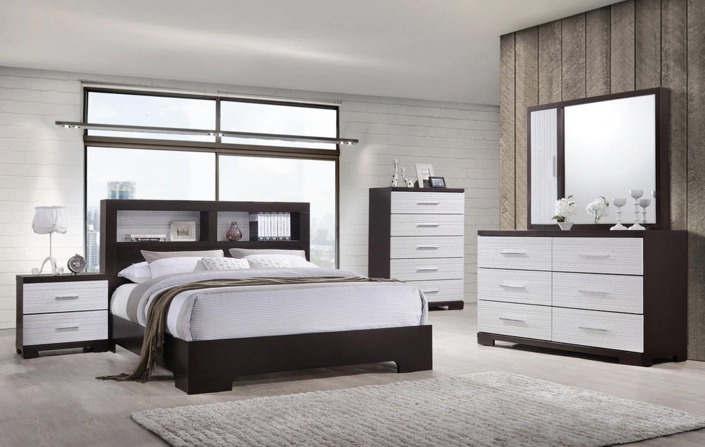 The Anyssa white brown dresser features a modern 2 tone design with storage headboard in bed.
