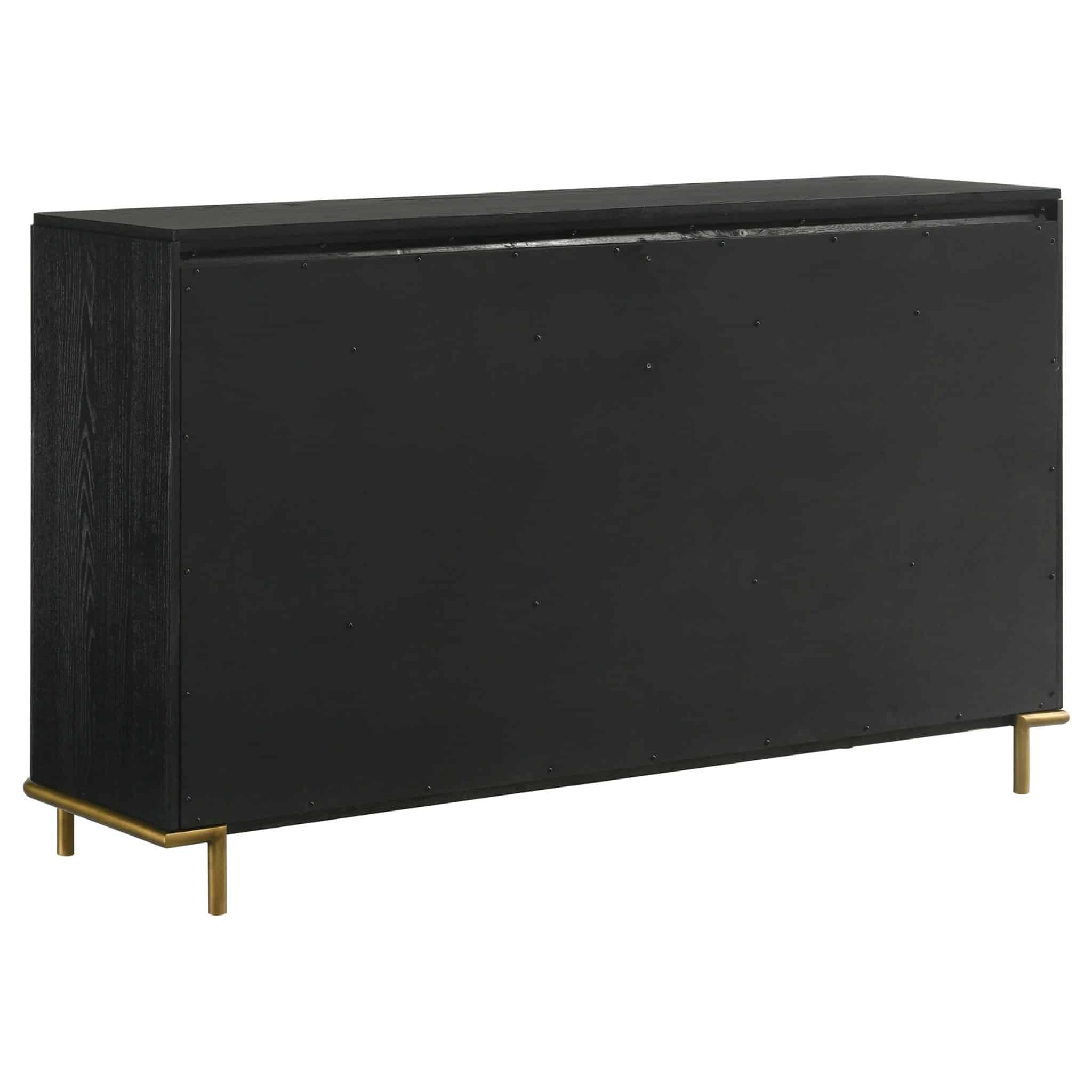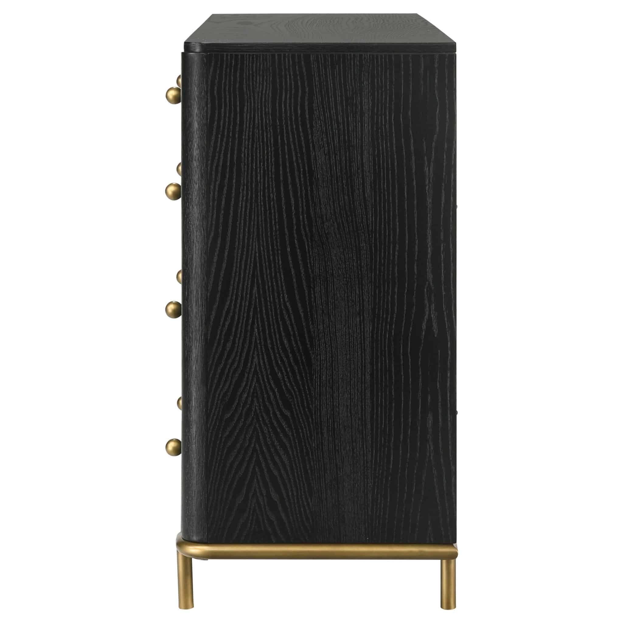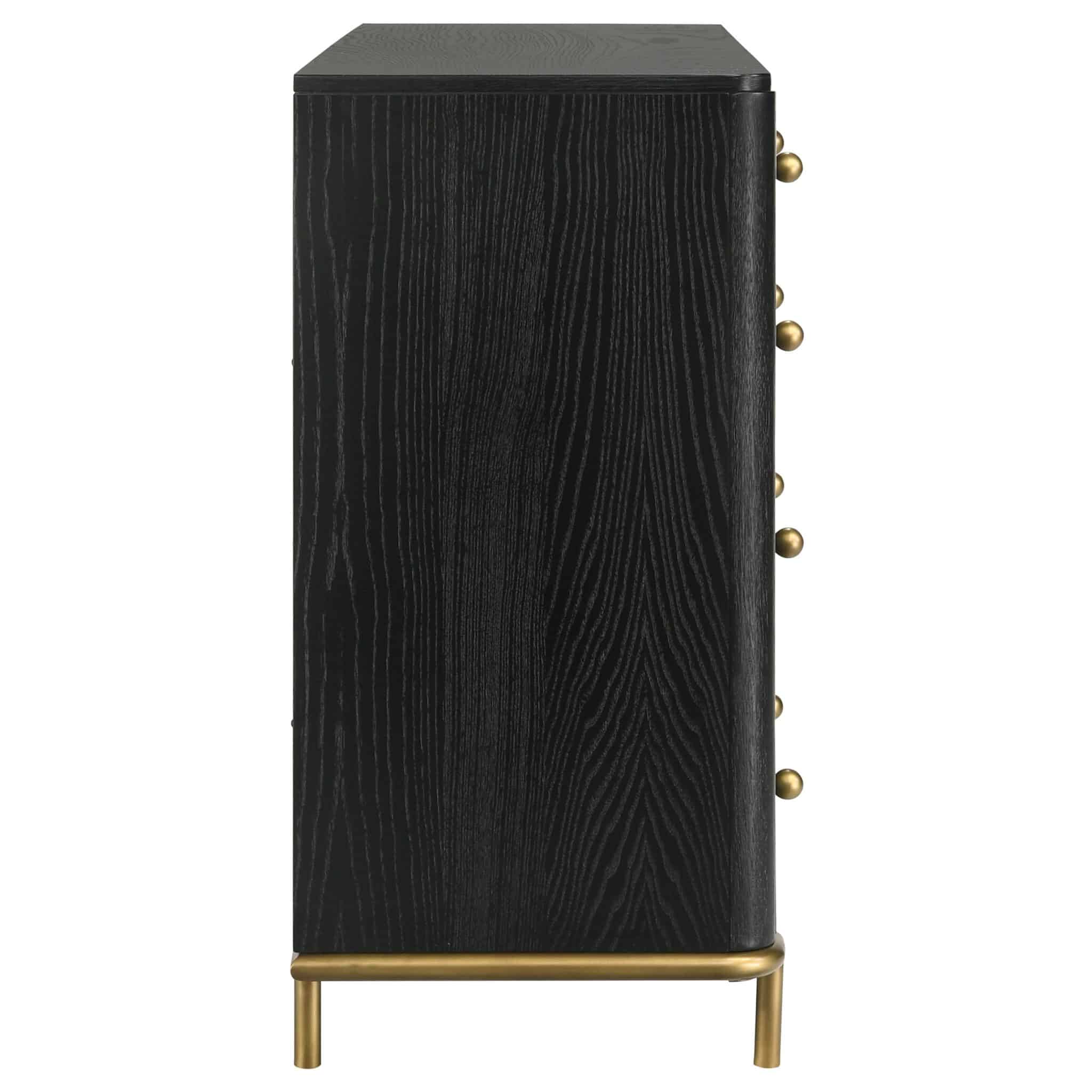 Introducing the Arini Mid Century Modern Black Dresser – a perfect blend of elegance and functionality. This modern dresser features eight spacious drawers, a dark brown wood grain finish, and gold finish accents, providing ample storage and a touch of luxury. Ideal for those seeking a stylish and practical addition to their bedroom, the Arini dresser is perfect for organizing and enhancing your space. Embrace the sophistication and practicality of this black dresser, a must-have for any contemporary home
