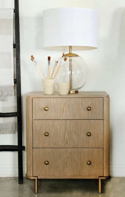 Retro-inspired elements come together in this mid-century modern, three-drawer nightstand, designed with a wire-brushed, sand wash finish and adorned with aged brass round knobs and slender metal tube legs. Extra thoughtful details such as a built-in dual USB port and a felt-lined top drawer make this elegantly shaped nightstand a perfect addition to contemporary and transitional bedrooms and guest rooms.
