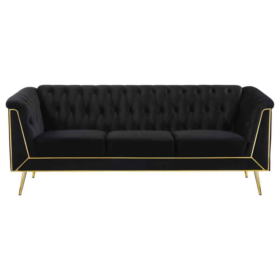 The Ascot black and gold sofa set is crafted from solid woods and is upholstered in black velvet. This frame features thin gold lining to give of a strong modern vibe. This gold trim then continues down to the 4 mid century modern gold legs that hold up the sofa. All 3 pieces feature a button tufted back rest and padded pocket coil seating for extra comfort.