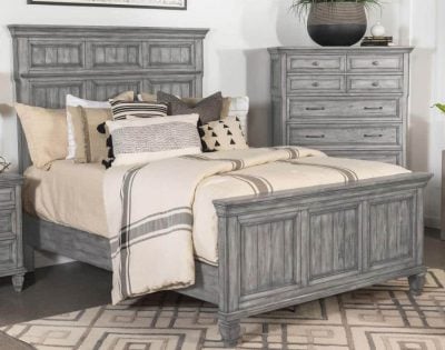 Elevate your modern farmhouse bedroom with this rustic-inspired traditional bed, designed with a stately oversized headboard with crown molding and wood paneling details. A weathered-like grey finish offers a neutral color palette that matches many color palettes and decor, lending a charming casual look to bedrooms and guest rooms.