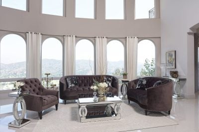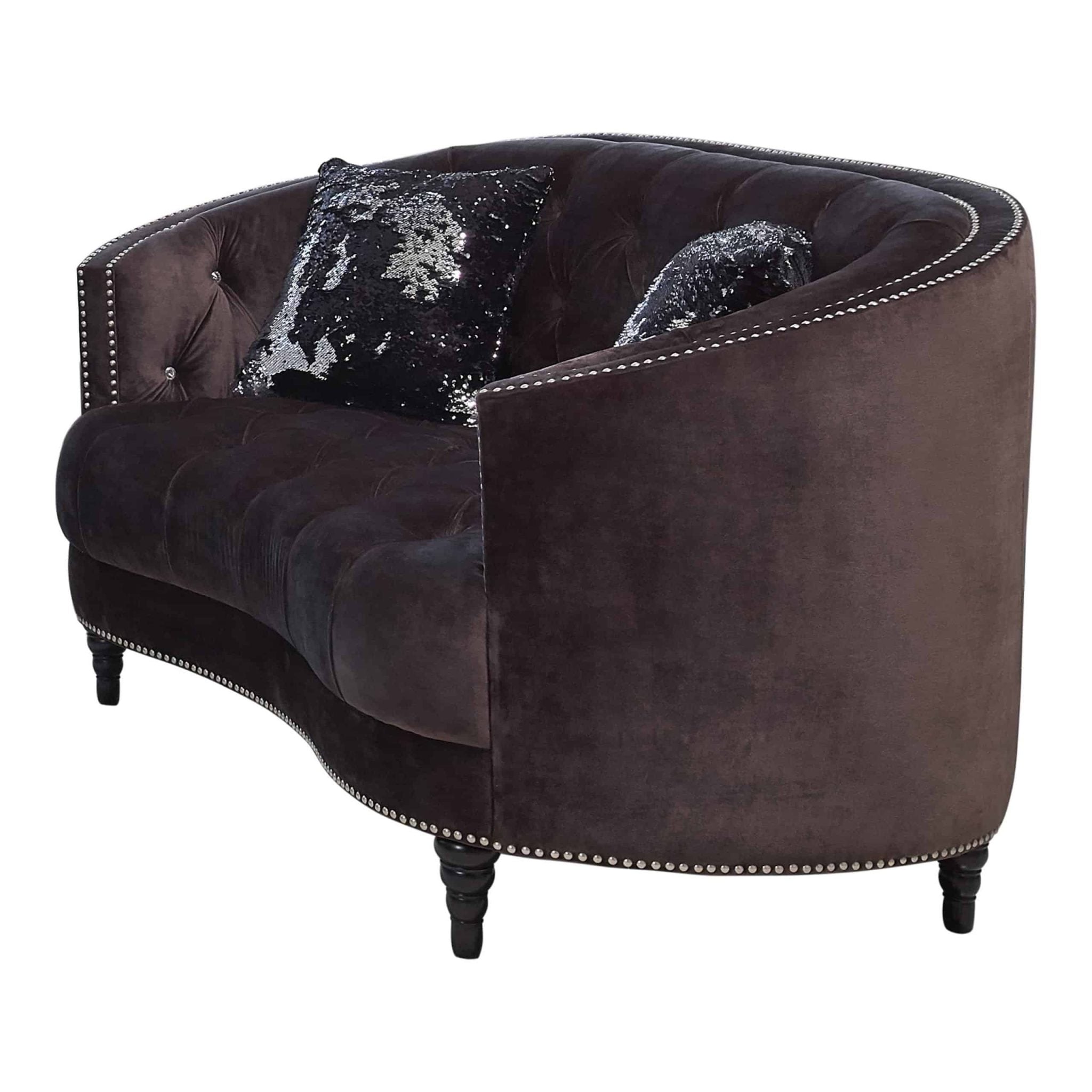 Bring your living space a modern spin on a classic sofa. This transitional style sofa features a graceful C-shape design that’s both comfortable and attractive. The soft velvet upholstery comes in a rich chocolate brown and features deep rhinestone button tufting for a touch of glam. Elegant chrome nailhead trim adds a lustrous accent that you’ll love. This sensational design is topped off by nicely turned legs and included complementary accent pillows to make this as fashionable as it is functional.
