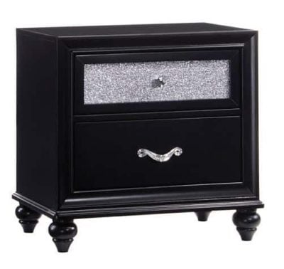 The Barzini II glam black nightstand features a statement with this bedroom set. Bedroom has metallic acrylic drawer fronts and facetted crystal hardware.