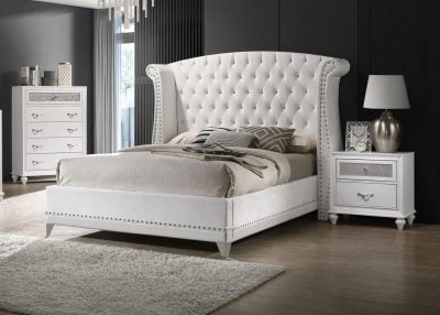 With our Barzini Plush White Velvet Bed youInstantly achieve an elegant upgrade for your sleeping space. A dramatic wingback headboard creates a focal point you can’t forget. It is adorned with button tufting and crystal-like accents. Nail head trim further enhances this piece on the headboard as well as the frame. It is supported on sleek tapered legs for an extra stylish appeal.