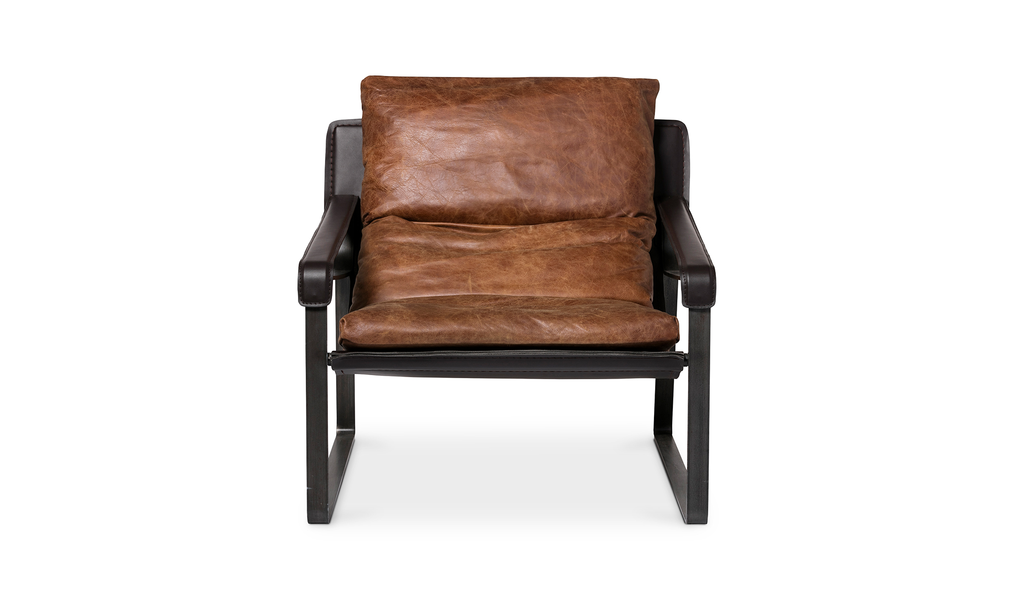 The Bram Top Grain Leather Modern Chair redefines luxury with its sculptural design and indulgent comfort. Crafted from 100% top-grain, aniline-dyed leather, it naturally ages into a rich patina over time. The artfully reclined leather sling seat is supported by a sleek iron frame with leather-wrapped armrests, blending industrial edge with contemporary style. A bonded leather support cushion filled with a feather-blend interior ensures plush comfort. Perfect for modern, industrial, or mid-century interiors, this statement chair enhances any space with timeless sophistication.