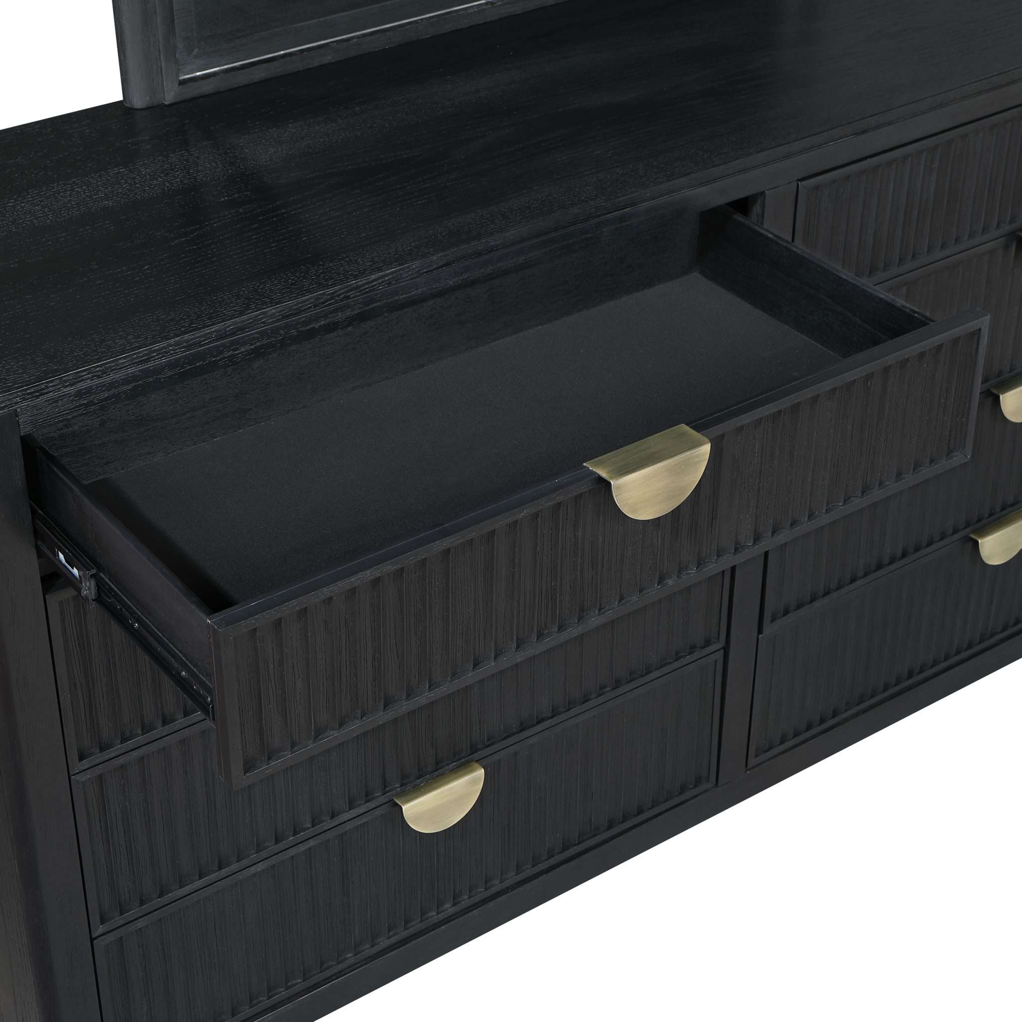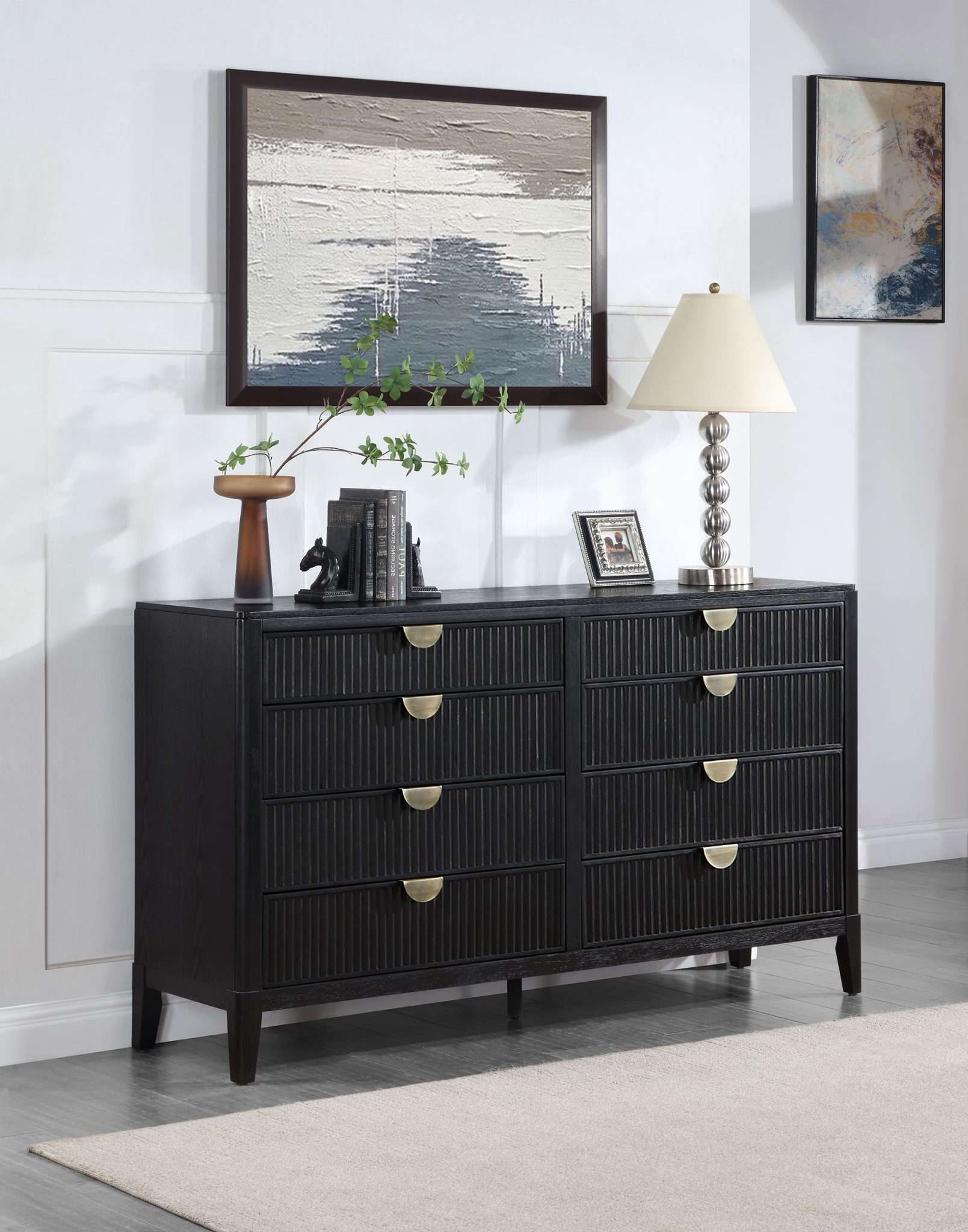 Introducing the Brookmead 8 Drawer Black Wood Dresser – a perfect blend of modern elegance and functionality. This contemporary dresser features a wire brushed black finish, fluted texturing on the drawer fronts, and half-moon golden pulls, providing a sophisticated and inviting feel. The felt-lined top drawers protect delicate items, while the spacious lower drawers offer versatile storage. Ideal for those seeking a stylish and practical addition to their bedroom, the Brookmead dresser is perfect for organizing and enhancing your space. Embrace the sophistication and practicality of this black wood dresser, a must-have for any contemporary home.