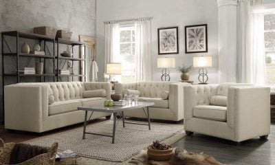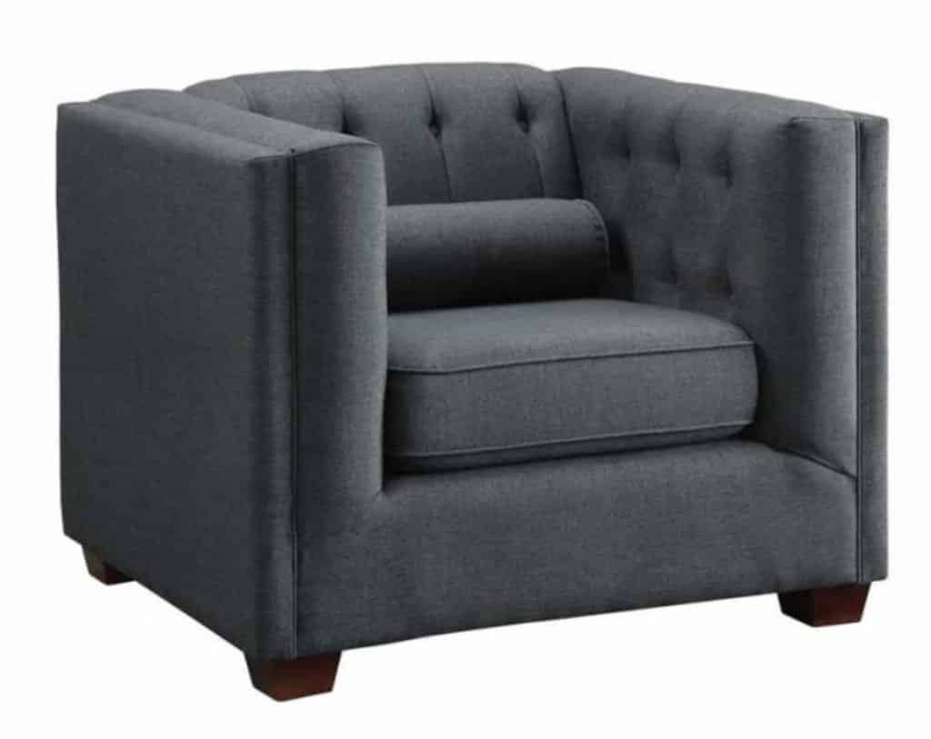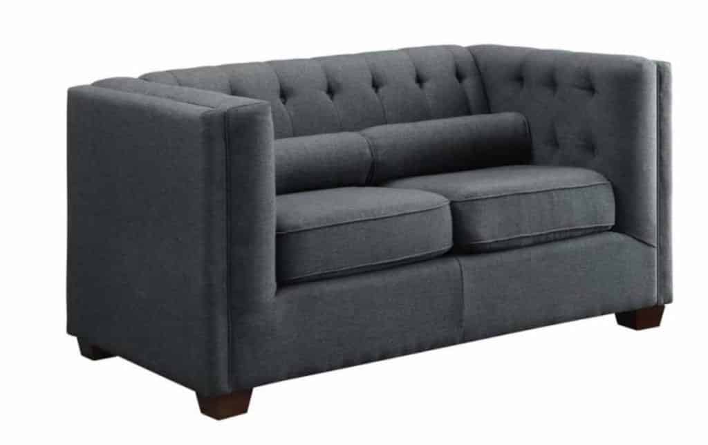 The Cairns Collection features high shelter arms, decorative tufted back, comfortable lumbar pillow included with fully reversible cushions. Set has a linen like fabric upholstery available in charcoal or oatmeal color. Also has solid wood legs and kiln dried hardwood frame.