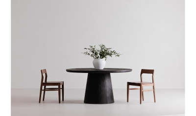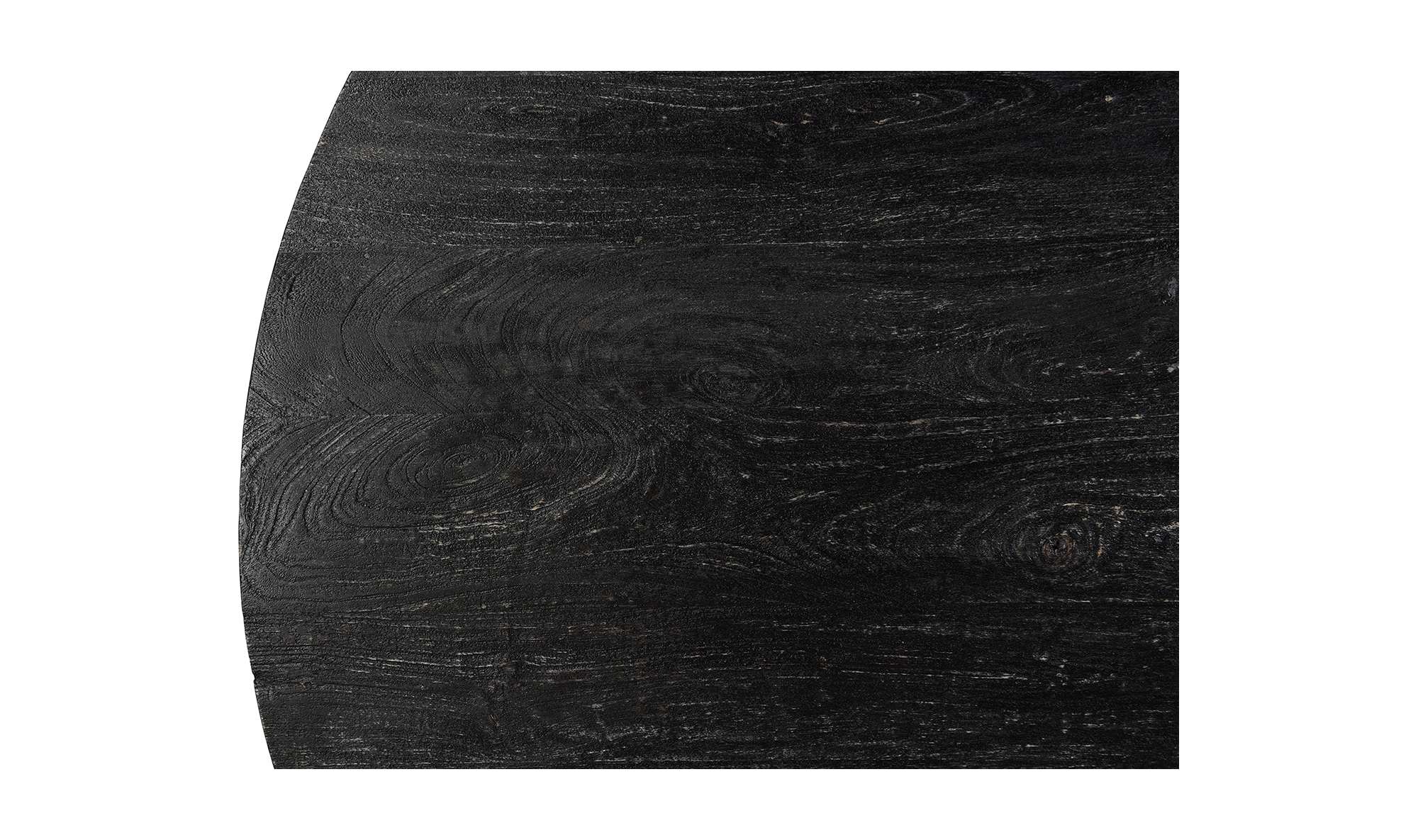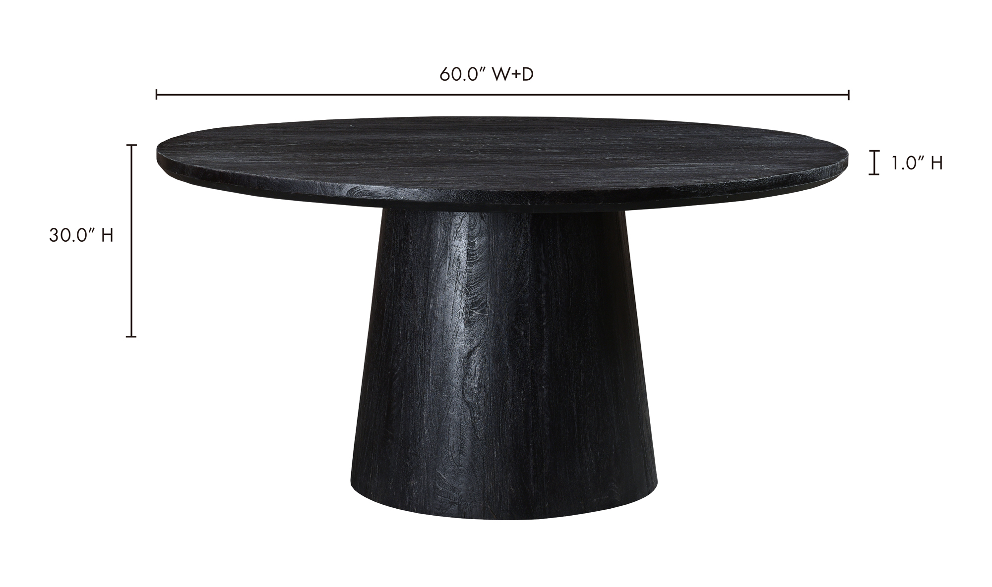 The Cember Black Mango Round Dining Table blends bold design with organic charm. Crafted from sustainably sourced solid mango wood, this black circular dining table features a sandblasted, cerused finish that enhances its natural wood grain. The oversized drum-shaped pedestal base adds a striking modern rustic aesthetic while ensuring stability. Designed for smaller dining spaces, this compact yet elegant black round table comfortably seats four guests. With its unique variations in grain and texture, no two pieces are alike, making it a one-of-a-kind addition to any home.