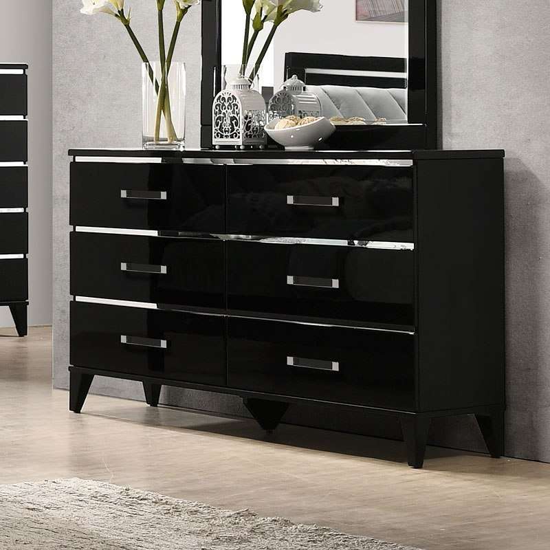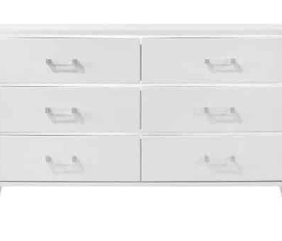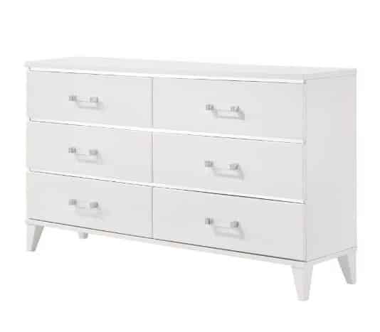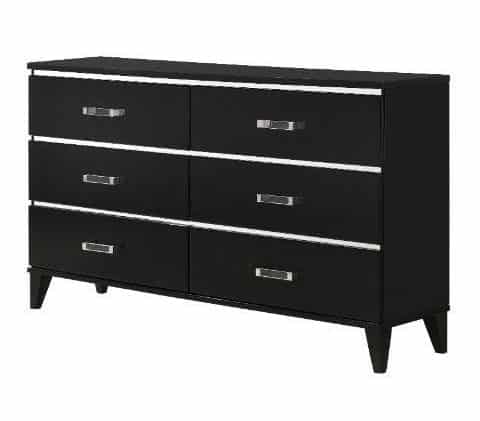 With the Chelsie modern dresser you can store your belongings in style! The sturdy dresser is a focal point on its own with its solid wood frame and tapered legs. Add depth and reflect light with its silver trim that is featured throughout the bed and case goods. The White or Black finish is excellent for adding a splash of color throughout your space without it clashing.
