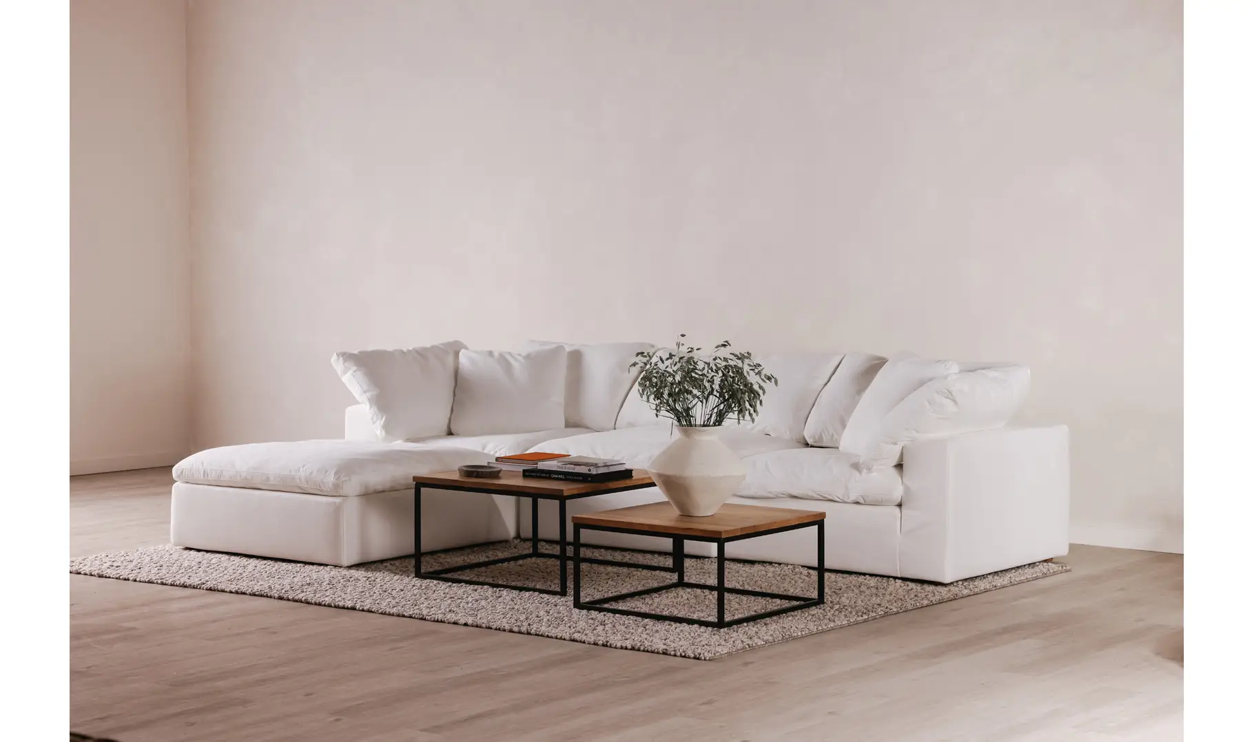 Elevate your living space with the Clay White Stain Resistant Cloud Sofa Sectional. This comfortable modular sectional is the perfect addition to any family-friendly home. Upholstered with LiveSmart Performance Technology Fabric, it is moisture repellent, stain resistant, and offers barrier protection. The cloud style cushions are generously filled with a feather and fiber blend, ensuring exceptional comfort and durability. With a top eight inches of foam-filled cushioning, you will sink into this ultra-comfortable white cloud sofa. The modular design allows for customizable configurations, and the minimal maintenance required makes it easy to keep your White Cloud Sectional Sofa looking its best. Truly a great value addition to any White Stain Resistant Couch.