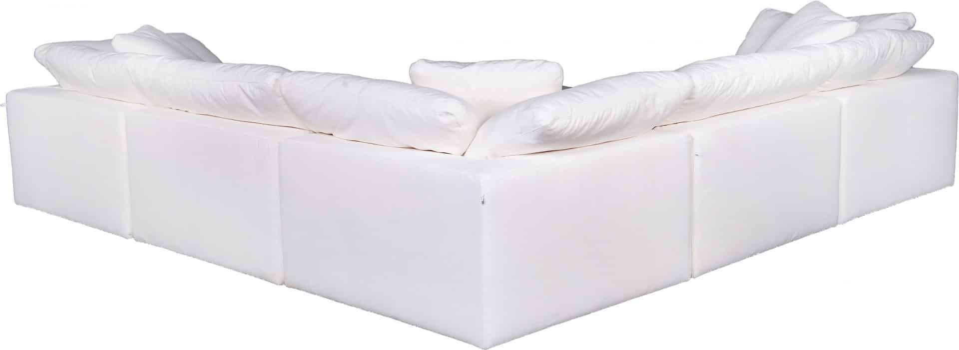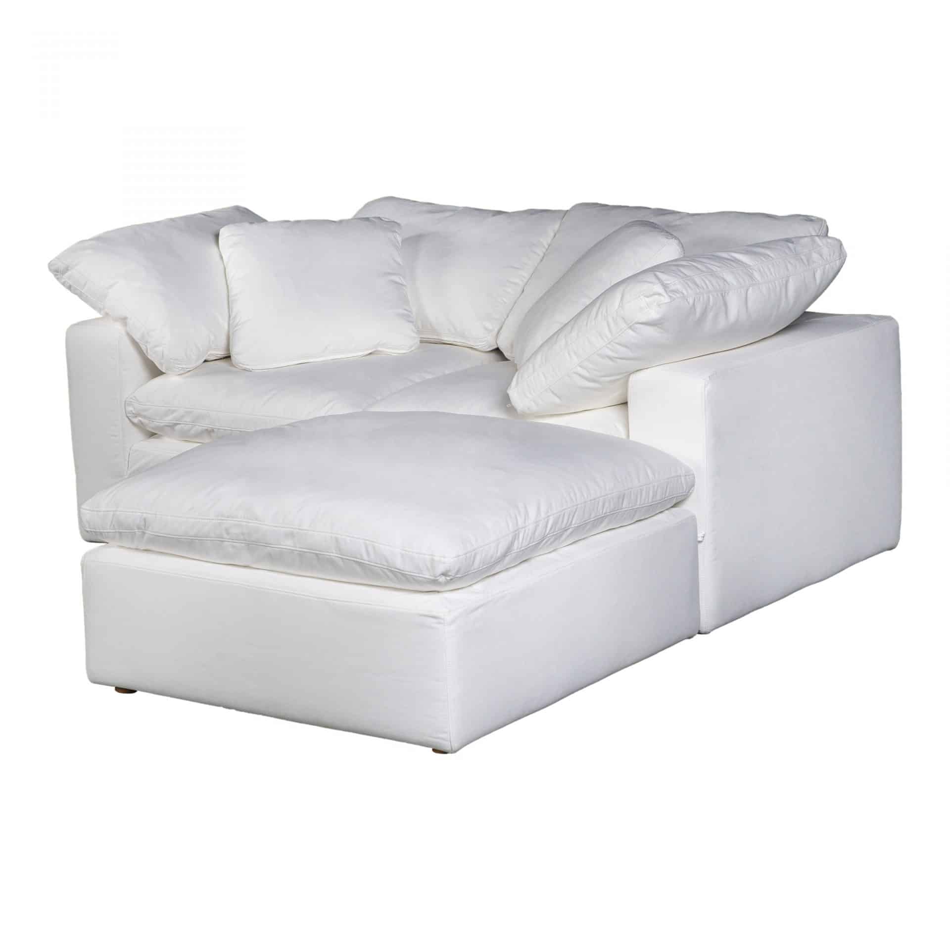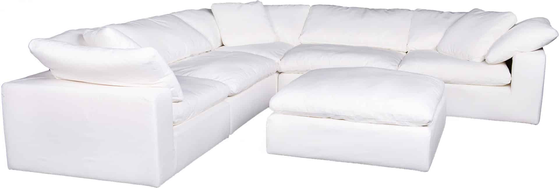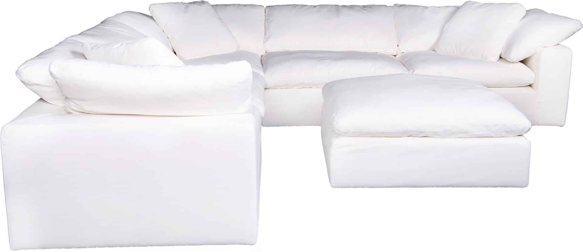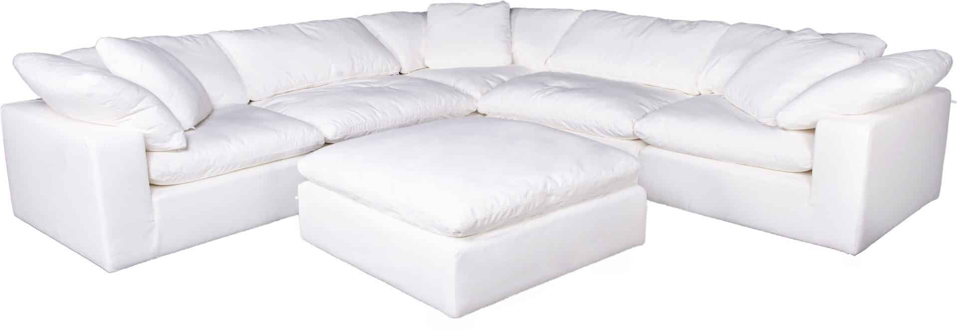 Elevate your living space with the Clay White Stain Resistant Cloud Sofa Sectional. This comfortable modular sectional is the perfect addition to any family-friendly home. Upholstered with LiveSmart Performance Technology Fabric, it is moisture repellent, stain resistant, and offers barrier protection. The cloud style cushions are generously filled with a feather and fiber blend, ensuring exceptional comfort and durability. With a top eight inches of foam-filled cushioning, you will sink into this ultra-comfortable white cloud sofa. The modular design allows for customizable configurations, and the minimal maintenance required makes it easy to keep your White Cloud Sectional Sofa looking its best. Truly a great value addition to any White Stain Resistant Couch.