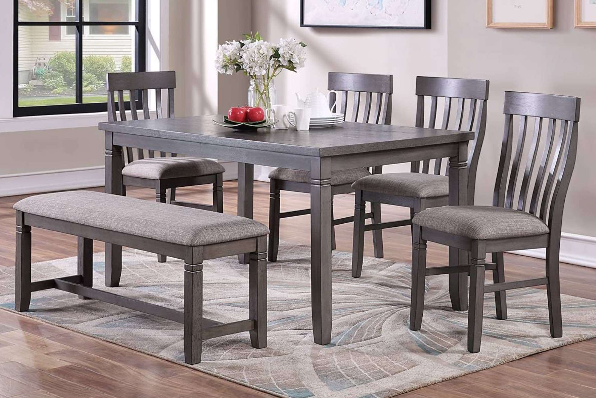 This spacious table set with elegant wood crafted design can transform your dining room into the perfect place to spend time with family and friends. The chairs have upholstered cushions to ensure extra comfort. The whole set includes one table, four chairs and a bench.