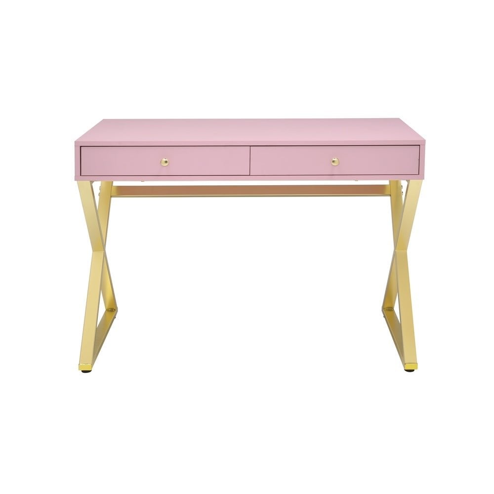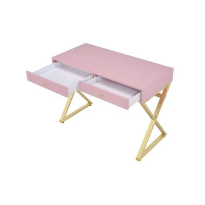 Simple, bold, and appealing, the Coleen Writing Desk will give your workplace a distinct look with contemporary style. The brilliant table top on trendy cross-base legs gives the desk a gorgeous and lustrous look. It has two storage drawers for your office supplies, with built-in USB port and plug keeping your devices charged. Create your own stylish work space with the Coleen Writing Desk.