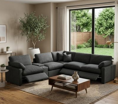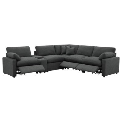 The Collins Dark Gray Modular Reclining Sofa combines state-of-the-art power technology with a versatile, customizable layout to create the ultimate entertainment centerpiece. Featuring three high-performance power reclining modules and two stationary sections, this sofa is upholstered in a durable, contemporary gray fabric that fits seamlessly into any modern decor. Its innovative “wall-hugging” design allows for a full recline with minimal clearance, making it a perfect solution for maximizing space in cozy living rooms or expansive home theaters.