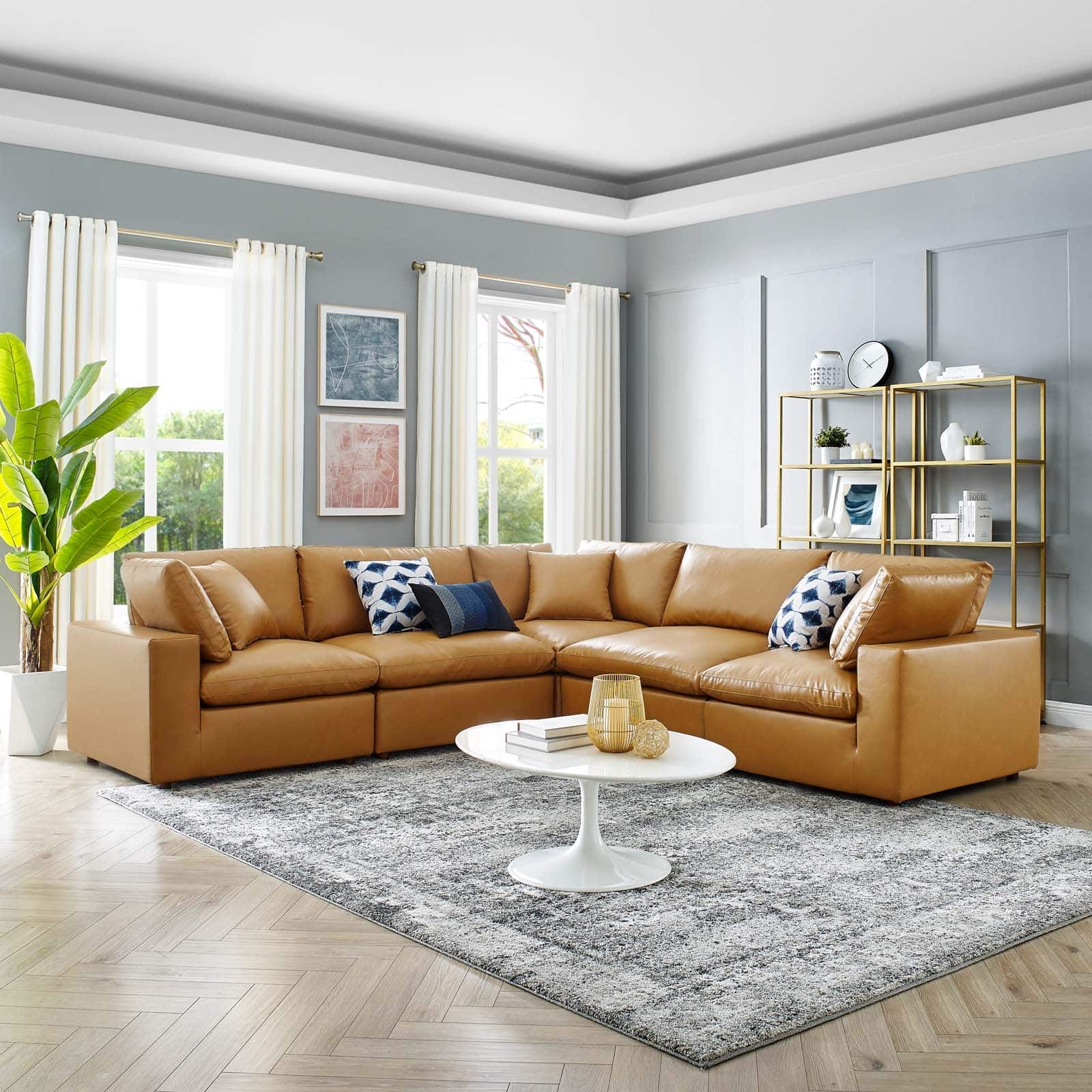 A haven for cozy relaxation, Commix features plush comfort, clean-lined design, and spacious profile, that makes an attractive statement in the modern home. Covered in vegan cognac brown leather, this upholstered sectional sofa comes with a solid wood construction and foam padded and duck down cushions for a luxurious sink-in feel. Commix features overstuffed down feather cushions that offer a feeling of relaxation and calming comfort while lounging, making it the perfect addition to the living room, family room, or game room. Made for sprawling out or curling up, Commix beckons you and guests to sit and stay a while.