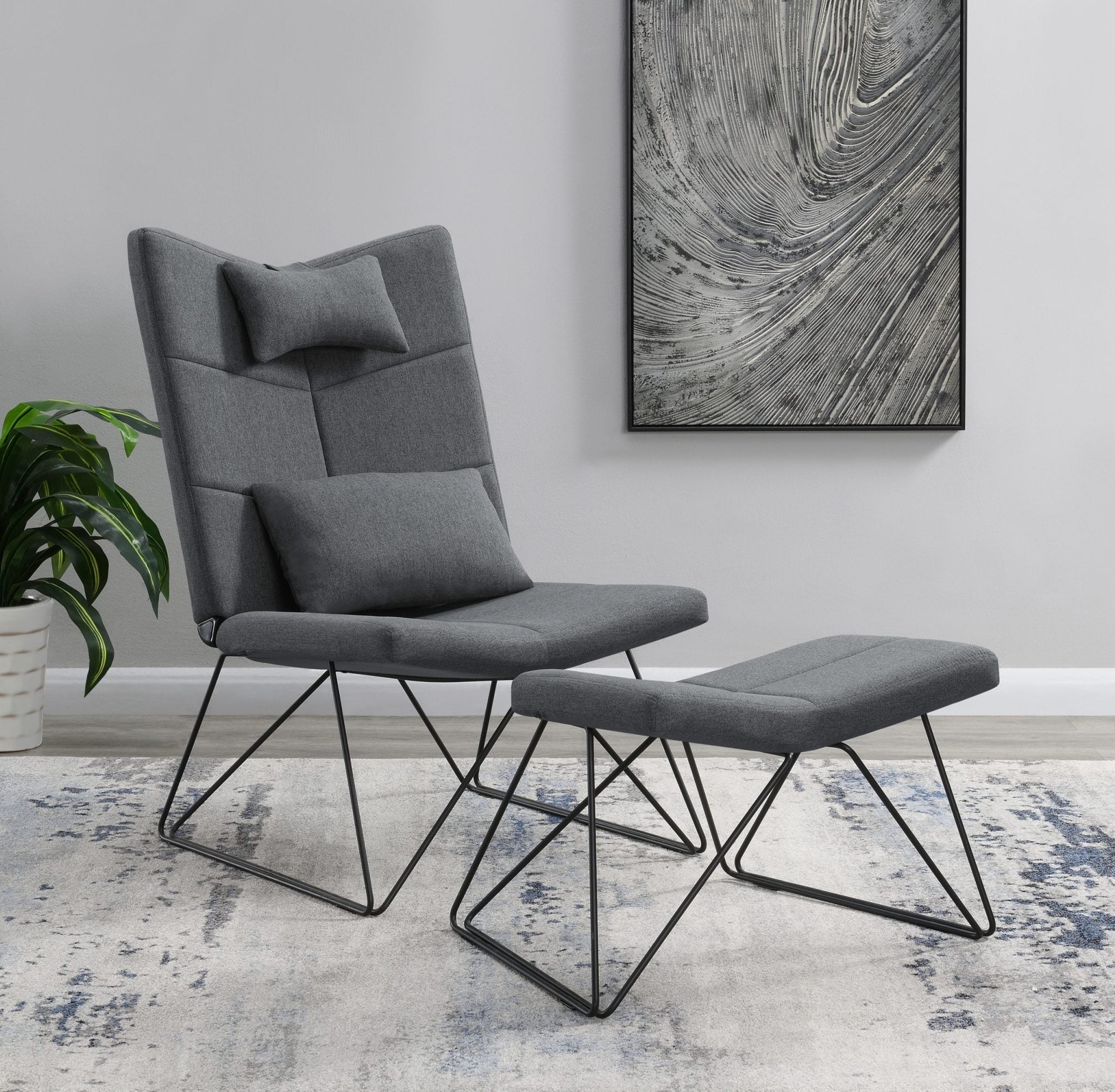 With the Conjure Padded Accent Chair & Ottoman you Create a noteworthy style in your space. Arrow-head inspired tufting and an angular backrest makes for an eye-popping appearance. Padded cushioning ensures this stylish accent chair is comfortable for everyday use. Its geometric base is a true work of art. Use this piece to instantly enhance modern living areas.