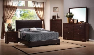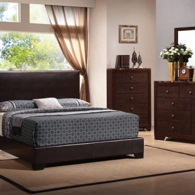 The Conner brown leatherette & wood bedroom set features a casual transitional style.