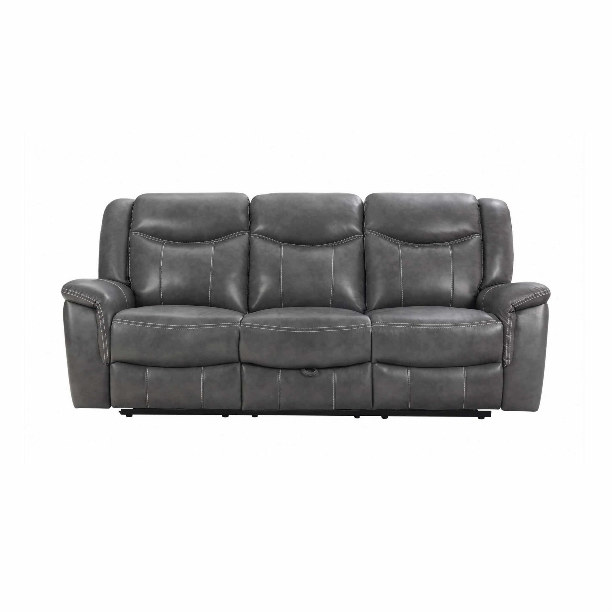 The Conrad grey reclining sofa set features cushions on the motion sofa and loveseat are decorated with bright stitching. Contemporary details, like a cool grey finish, give this set a chic personality. The comfortable head and arm rests are rounded and refined. Full of style and grace, this set is perfect for sophisticated relaxation.