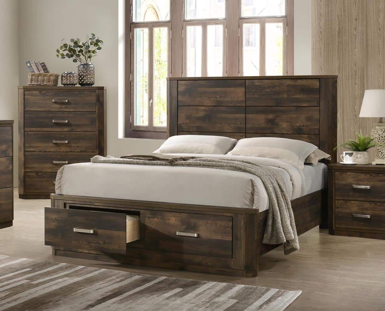 The simple lines and walnut wood tones create a sooth-full aesthetic with this plank influenced bedroom set. Practical design features include easy grasp pulls that accentuate the collection with a polished finish. The bed provides ample storage with drawers that hide seamlessly within the footboard. Dresser and chest offer room to store essentials and the rectangular mirror rounds out this set for a remarkable rustic style.
