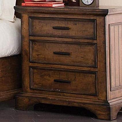 The Elk Grove rustic wood nightstand features a rich bourbon finish with rough sawn planks.