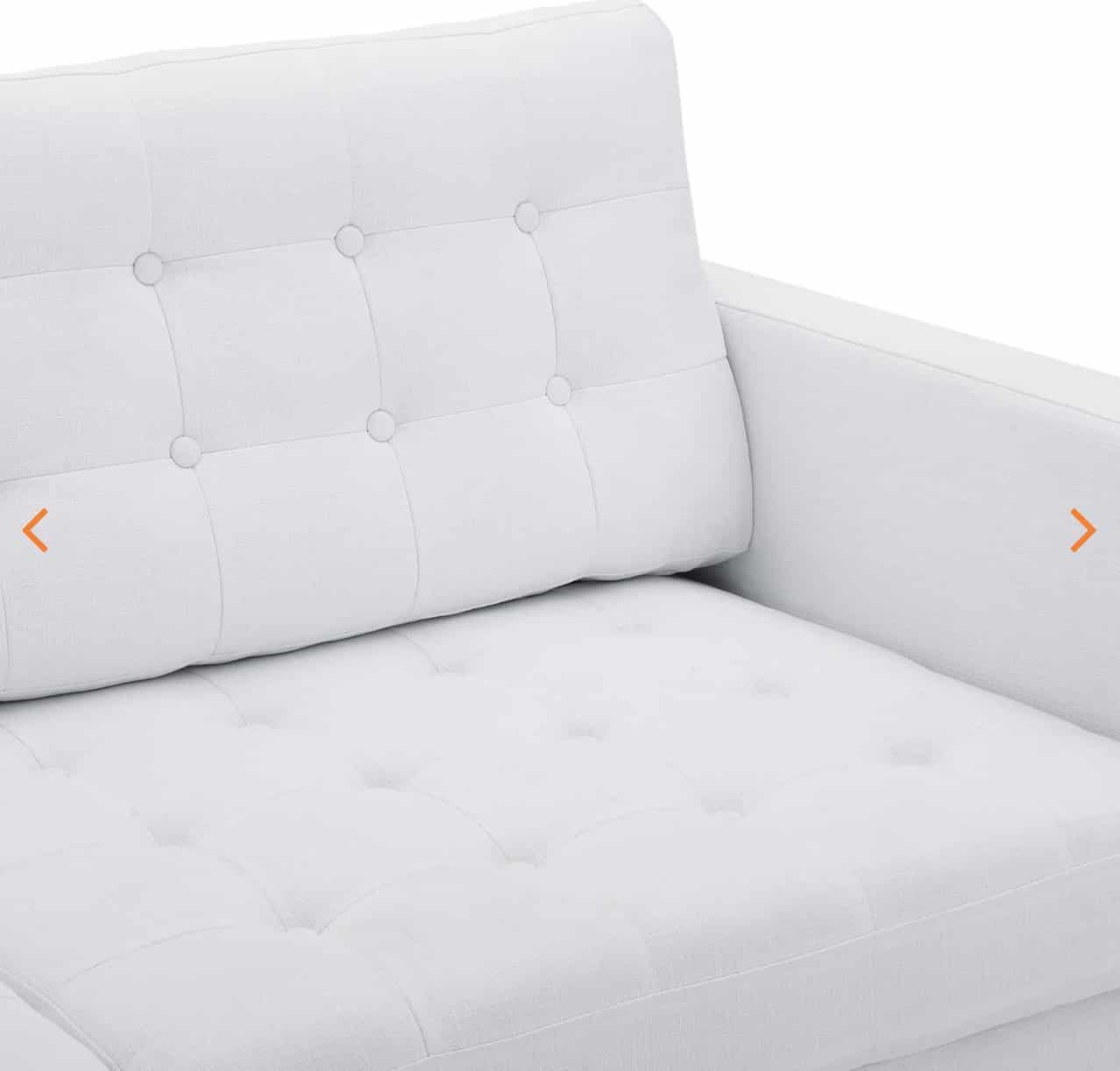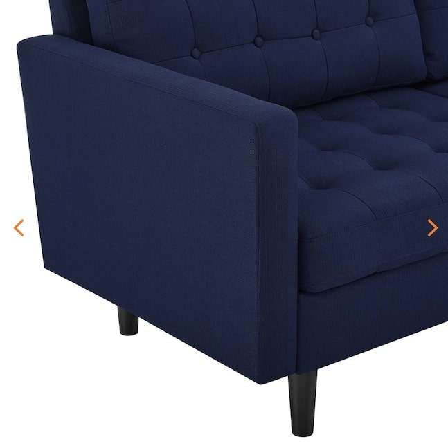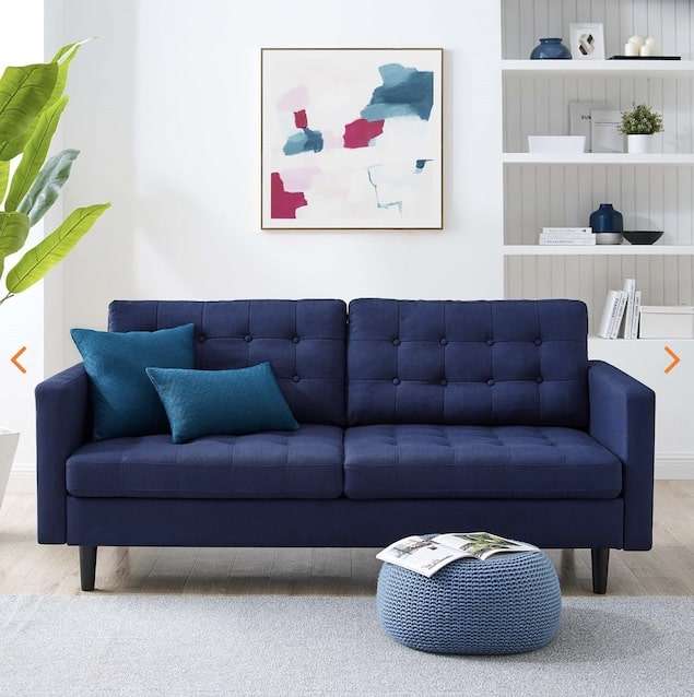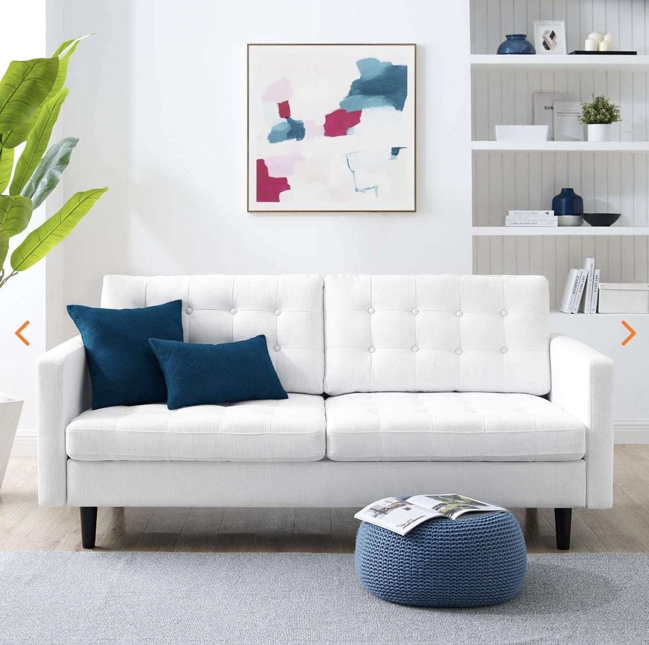 Reinspire decor in a home, office, or apartment with the Exalt Tufted Fabric Sofa. Featuring deep button tufting and rounded edges, this upholstered sofa abounds in contemporary style and mid-century modern design. Upholstered in soft polyester fabric, this tufted sofa is complete with dense foam padding and a sinuous spring support system for a premium seating experience. This fabric sofa is crafted with durable solid wood and rests on four black wood legs with foot pins to protect flooring. Bring retro modern charm to your living room, bedroom, lounge room, den, or home office with Exalt.
