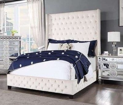 Fabrice Beige Velvet Bed With Tall Tufted Headboard