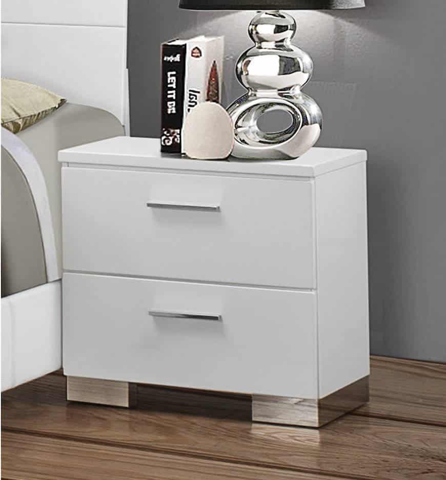 The Felicity Bedroom Collection features a modern design with clean lines and a sense of minimalism. The bedroom set has a glossy white finish with chrome legs.