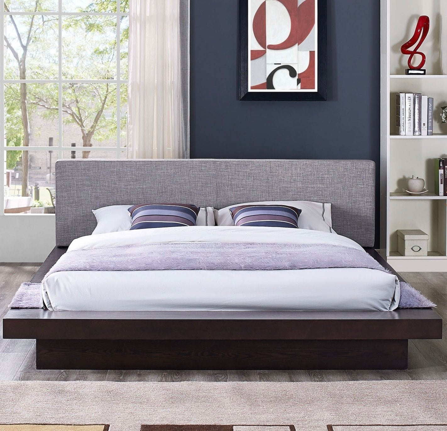 Instantly transform your bedroom landscape with the Freja Platform Bed. Designed with clean straight lines and a compelling aesthetic, Freja features a sturdy base with cappuccino veneer, foam-padded headboard upholstered in polyester fabric, slatted support that eliminates the need for a box spring, and a reinforced center beam with supporting legs for maximal stability. Update your bedroom décor with an engaging platform bed which evinces a refined look and striking design. Freja admirably supports mattress types such as memory foam, spring, latex, and hybrid.