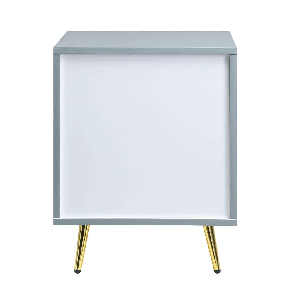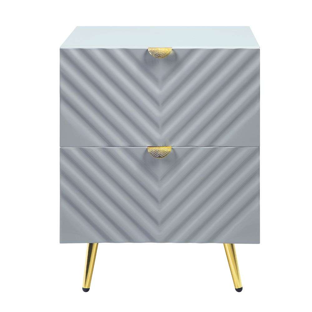 The Gaines gloss gray and gold nightstand is a glamorous and sophisticated grouping that adds a chic style to any room. The gray gloss finish and gold metal accents help to accentuate the clean lines of the pieces and add a pop of glamour. The diagonal line design adds visual interest and texture, making each piece stylish. With a variety of storage options to meet your needs.