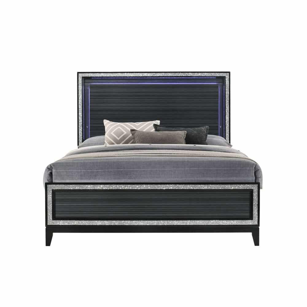 The Haiden Black LED Bed features a classic design with touches of modern aspects makes this Haiden Collection ideal for any bedroom. The bed offers a padded headboard with LED light. It also features a glamorous shimmering silver accent trim that adds richness to design. The black finish makes it easy to fit into already existing decor. The LED Bed frame is available in Queen or King size. The Haiden LED Bedroom Set is also available in White.