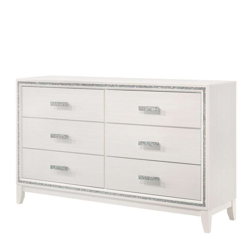 The Haiden Modern White Dresser features a classic design with touches of modern aspects makes this Haiden Dresser ideal for any bedroom. Complete this collection with the Haiden White LED Bedroom set. The piece offers a rectangular tabletop and six storage drawers for displaying or organizing. It also features a glamorous shimmering silver accent trim that adds richness to design. The drawer handles with the same shimmering silver tie them all together to create a cohesive look. The white finish makes it easy to fit into already existing decor.