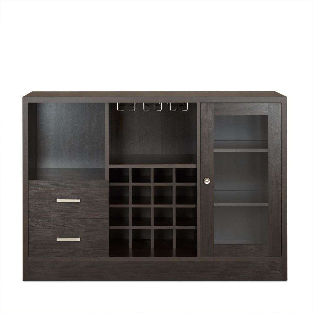 Store your beloved wines with this classic but trendy rectangular Hazen server to have them ready anytime. This server has 1 front door with 2 shelfs inside , 2 drawers, 2 open compartments, wine rack and steam ware glass rack, providing plenty storage space for your convenience. Keep it close to your dining table to tuck away glasses, napkins and other essentials. Finished with rustic oak wooden frame, it will fit naturally in any design.