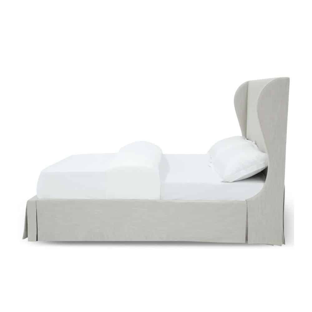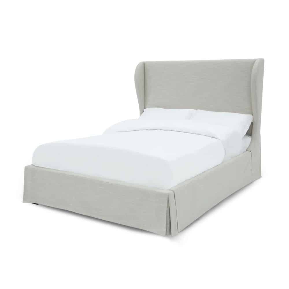 Designed with clean lines in an array of colors, our Juliette upholstered bed collection brings relaxed luxury to your bedroom. Made with solid wood framing, layered foam and soft linen-blend fabric, this group creates a no-maintenance slipcover look with skirted bases and inverted corner pleats. Available in panel, wingback, camelback and clipped corner configurations.