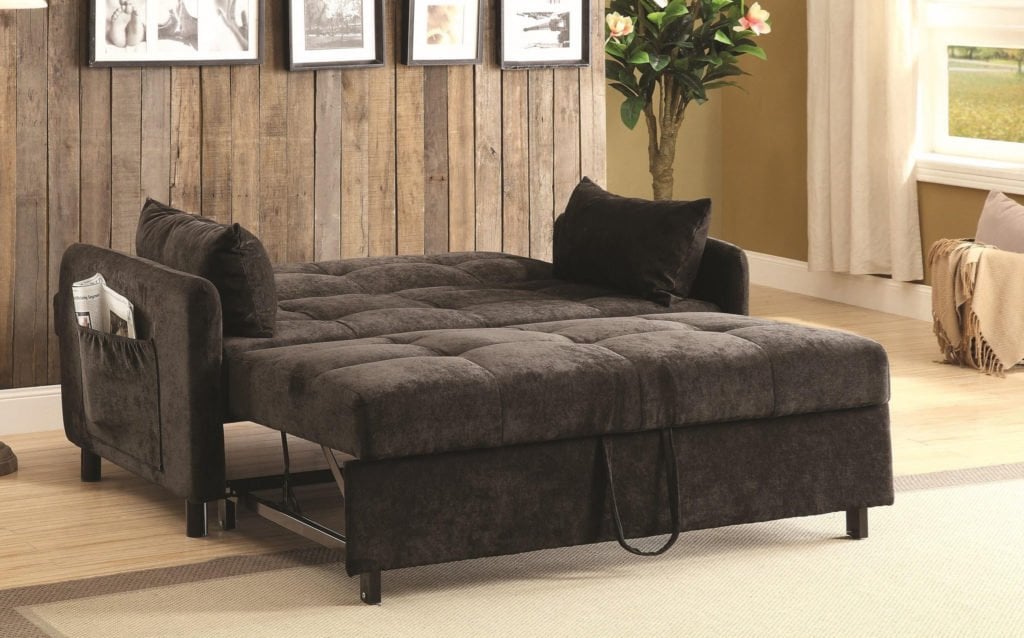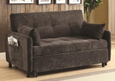 The Jans Sofa Bed Futon features a pull-out sleeper mechanism upholstered in dark brown twill fabric