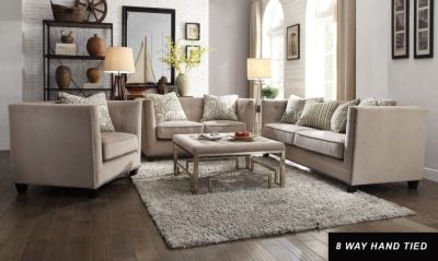 The Juliana Collection features a classic, contemporary modern design with 8 Way Hand Tied Sofa, Loveseat & Chair.