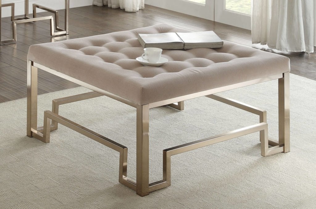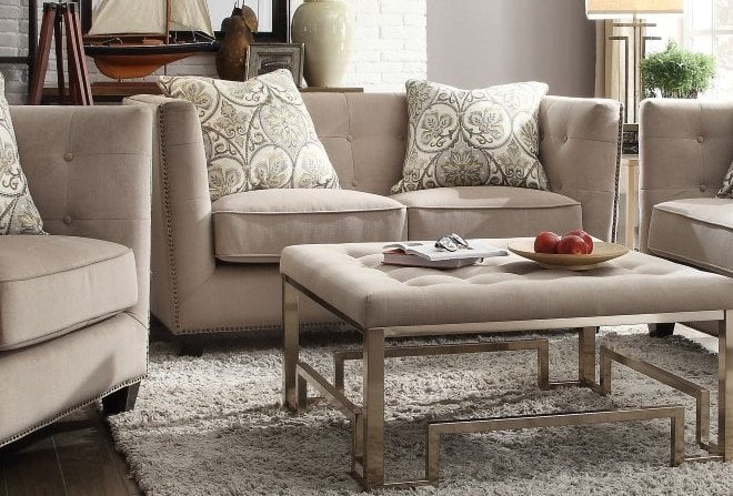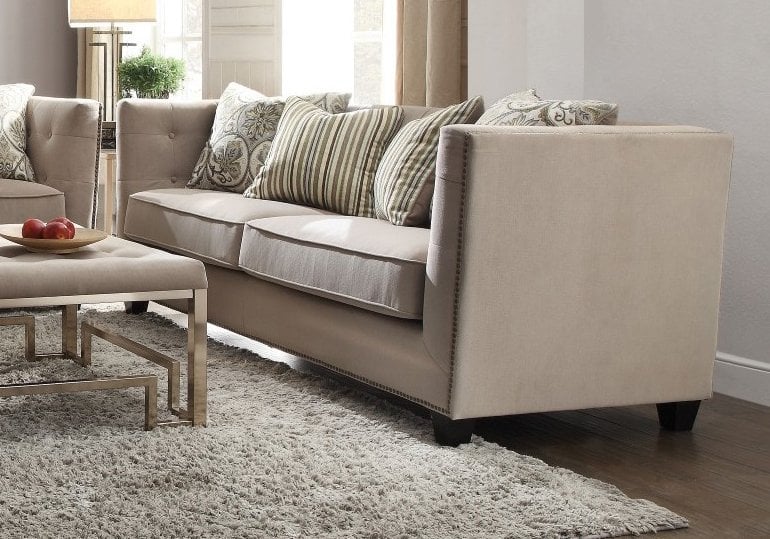 Set also has down feather filled, nail head trim, wooden block leg and button tufting.