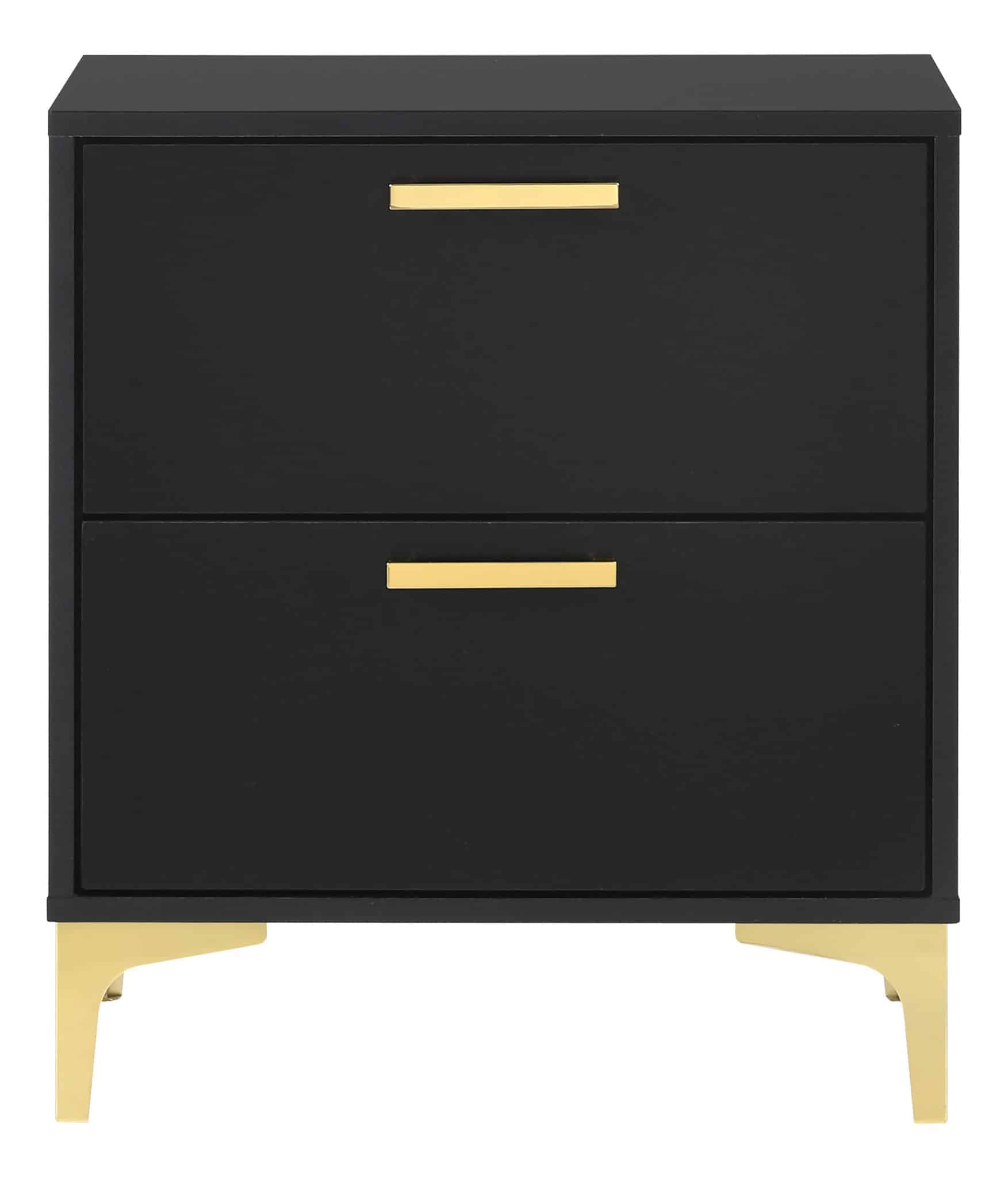 Create your glamorous bedroom retreat with this elegantly modern platform bed. A rectangular headboard with diamond button tufted details invites you to lean back and unwind each night. Shiny, gold finished bars make up the buttons, offering a sleek metallic touch. At the foot of the bed are gold bracket legs that bring a unified look. A black velvet fabric lends a soft and supple feel against the skin.