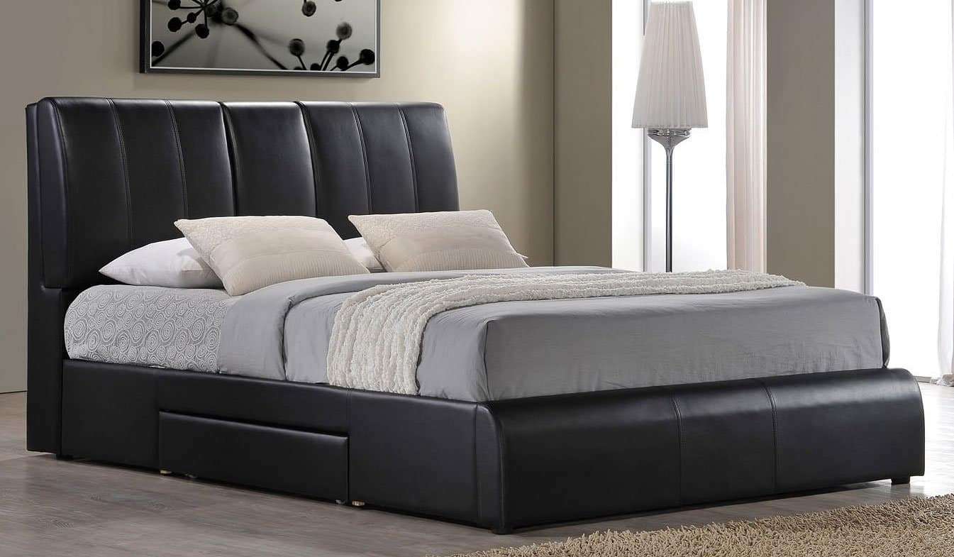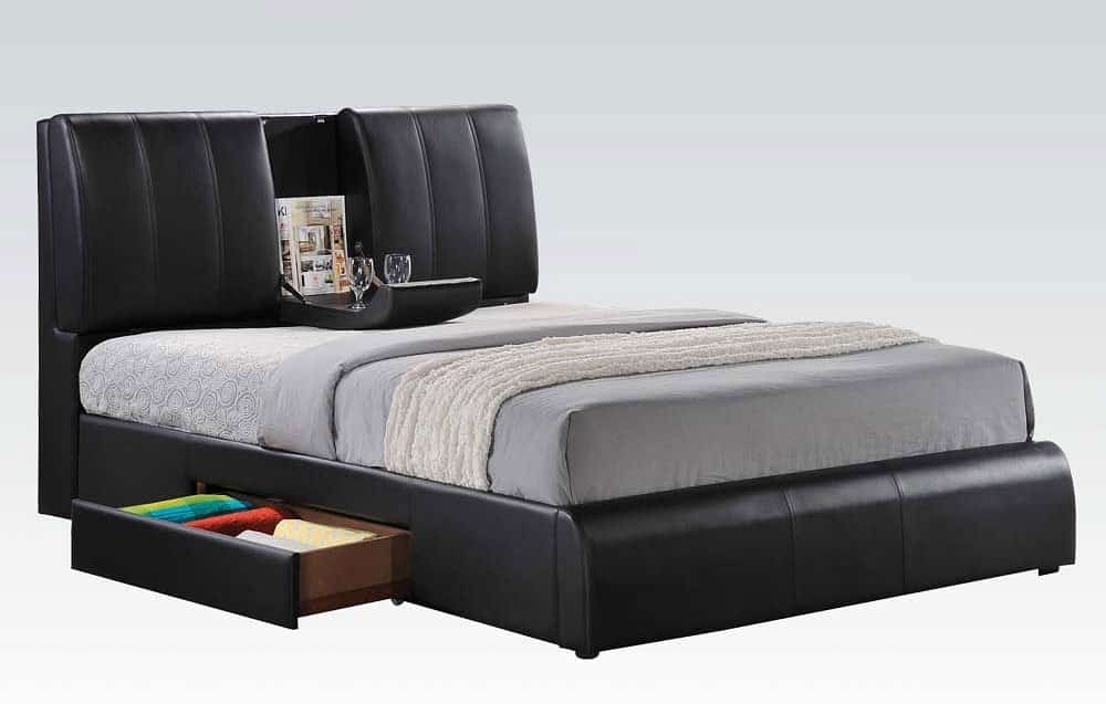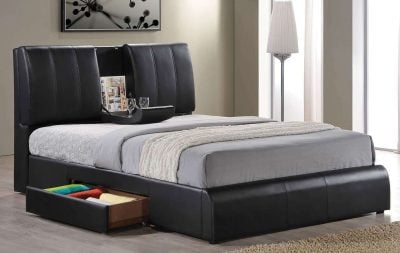 The Kofi black leatherette storage bed with cup holder features a modern contemporary bed. With space saving storage underneath, this bed has a functional style for any bedroom.