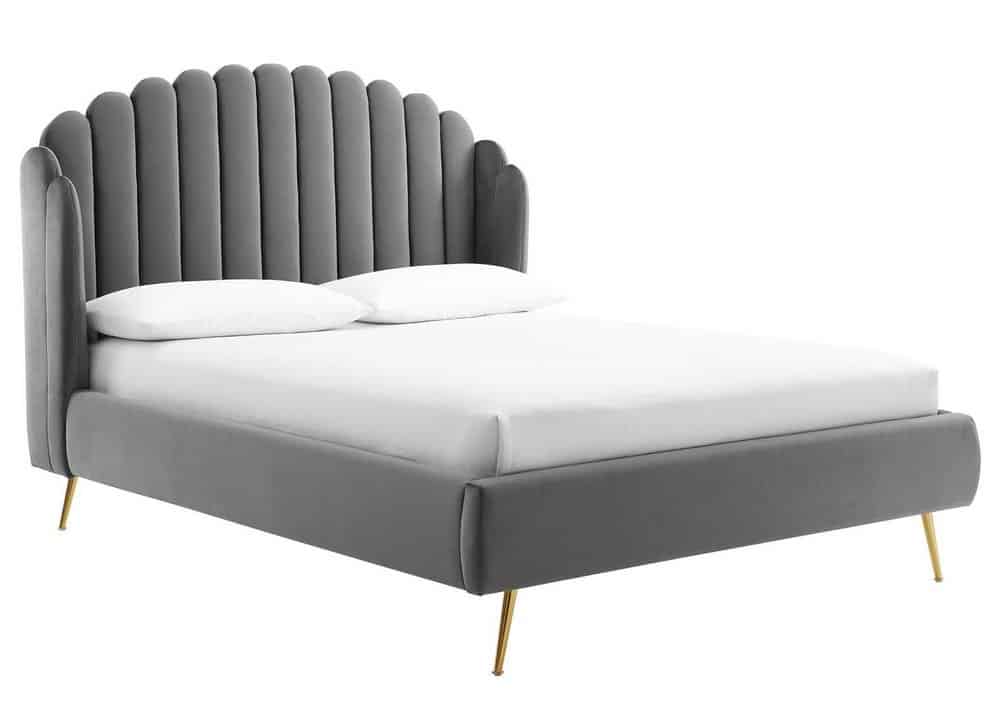 Update your master bedroom or guest suite with comfortable sleep and elegant style with the Lana Performance Velvet Queen Platform Bed. A modern twist on a classic wingback tufted bed, the queen headboard of this platform bed features beautiful channel tufting with an arching scalloped design. The queen headboard and siderails of this wingback bed are upholstered in soft, stain-resistant performance velvet and feature dense foam padding that offers comfort and support while relaxing in bed. Resting atop gold metal legs, this vintage modern bed comes with a sturdy wood slat support system with a reinforced center beam that eliminates the need for a box spring. Abounding in glam deco style, Lana is a luxurious mattress foundation that promotes healthy air circulation for memory foam, innerspring, latex, and hybrid mattresses.