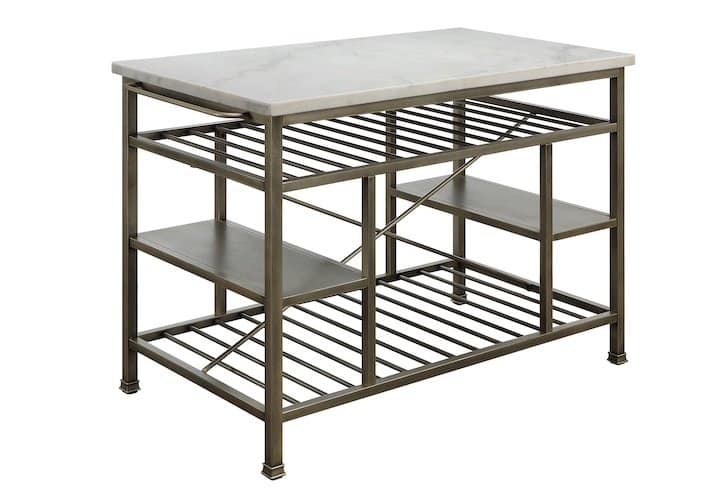 Designed with a gunmetal or antique gray pewter finish, the Lanzo island showcases exposed metal shelving and clean lines. The white marble top provides a polished, easy-to-clean surface ideal for food preparation and presentation. If you’re searching for a versatile kitchen server with modern charm, this island delivers.