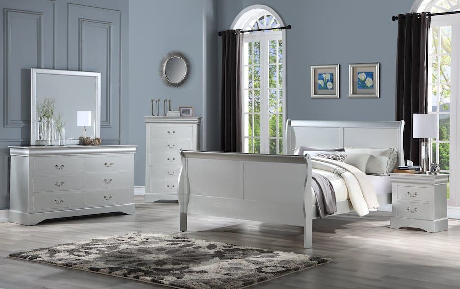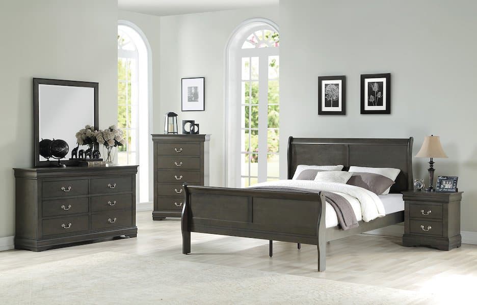 The Louis Philippe bedroom set has a casual, classic style. An eye catching sleigh bed lies at the center of this classic bedroom set. Finished in a classic finish with metal hardware, the simple moldings and luxurious pull handles add subtle style and appealing detail to each piece.