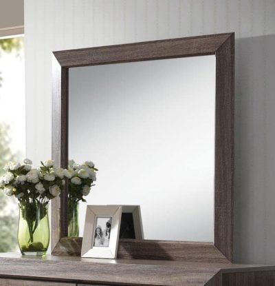 The Lyndon Modern Weathered Grey Mirror features a rustic master room. With horizontal line design adding a modern touch.