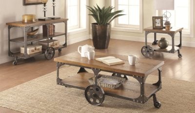 Crafted with a solid wood top and reinforced with metal trim and brackets, this industrial coffee table with wheels is built to last. The large wheels not only complete its vintage look but also make repositioning easy and convenient.