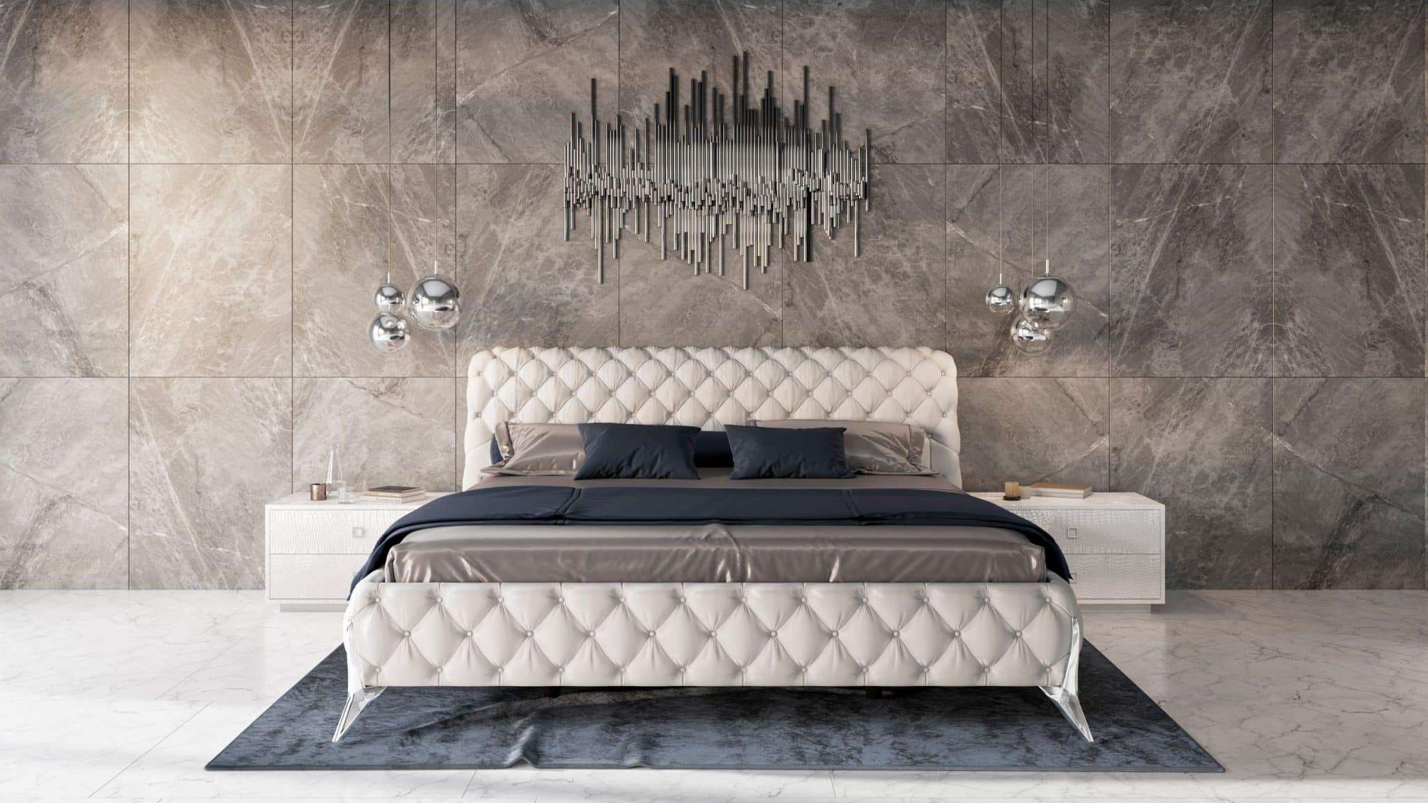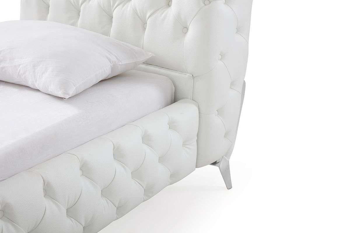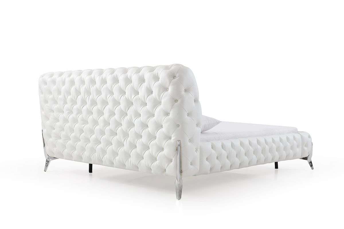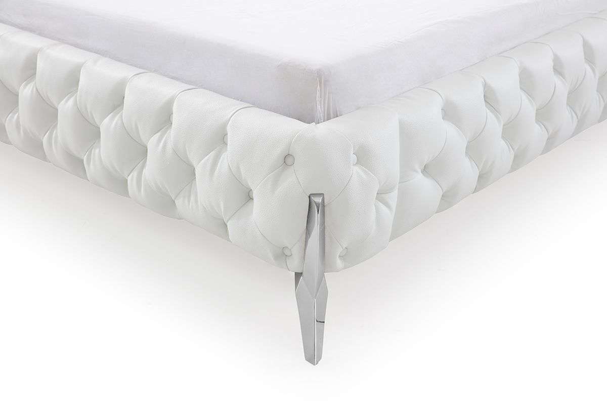 Prepare for a luxurious slumber with the Modrest Legend Modern White Leather Bed. This bed, draped in refined white leather, becomes the focal point of your bedroom, infusing it with a captivating modern classic charm. The Modrest Legend Bed features eye-catching diamond button tufts on the medium-height padded headboard and bed sides. This detailing enhances the bed’s luxurious comfort, inviting you to sink into its sumptuous embrace. This bed stands on robust, polished, tri-shaped stainless steel legs. These offer solid support and complement the bed’s sleek lines, reinforcing its modern allure. The Modrest Legend Bed is more than just a resting place—it’s a haven of style and comfort. This modern white bonded leather bed draws you into a deep and revitalizing sleep, ensuring you wake up refreshed and ready for the day. Indulge in the luxury and comfort offered by the Modrest Legend Modern White Bonded Leather Bed. It’s a stylish addition that transforms your bedroom into a sanctuary of relaxation.