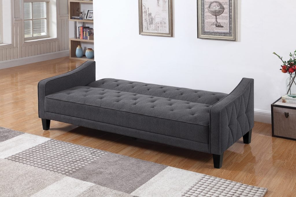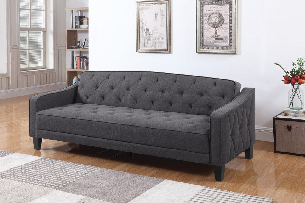 The Nale gray fabric sofa futon featured tufted seating and arms on a contemporary design